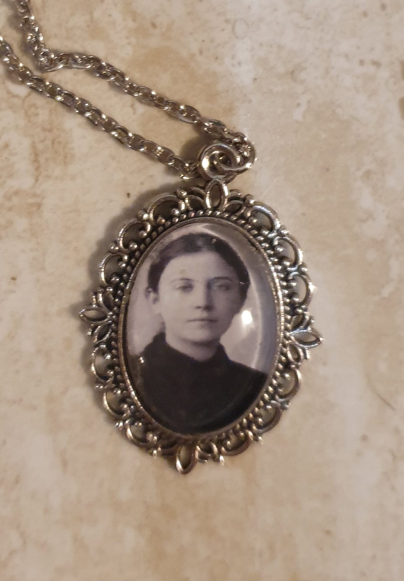 Piękny, stylowy medalion na łańcuszku z prawdziwym (fotografia) wizerunkiem Św. Gemmy Galgani. Szklane, wypukłe oczko, oprawione jest w metal w kolorze patynowanego srebra. Ręczna robota.