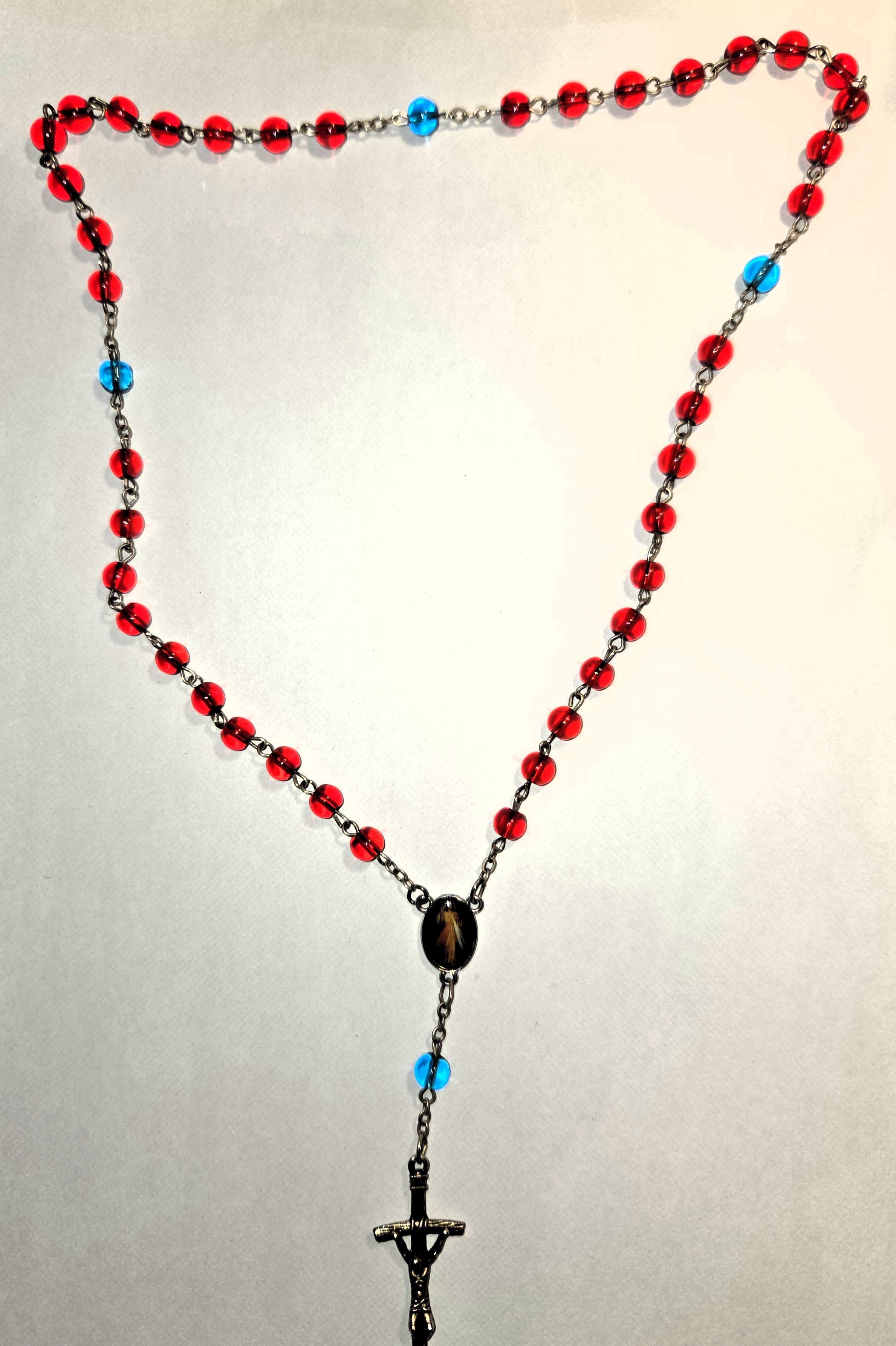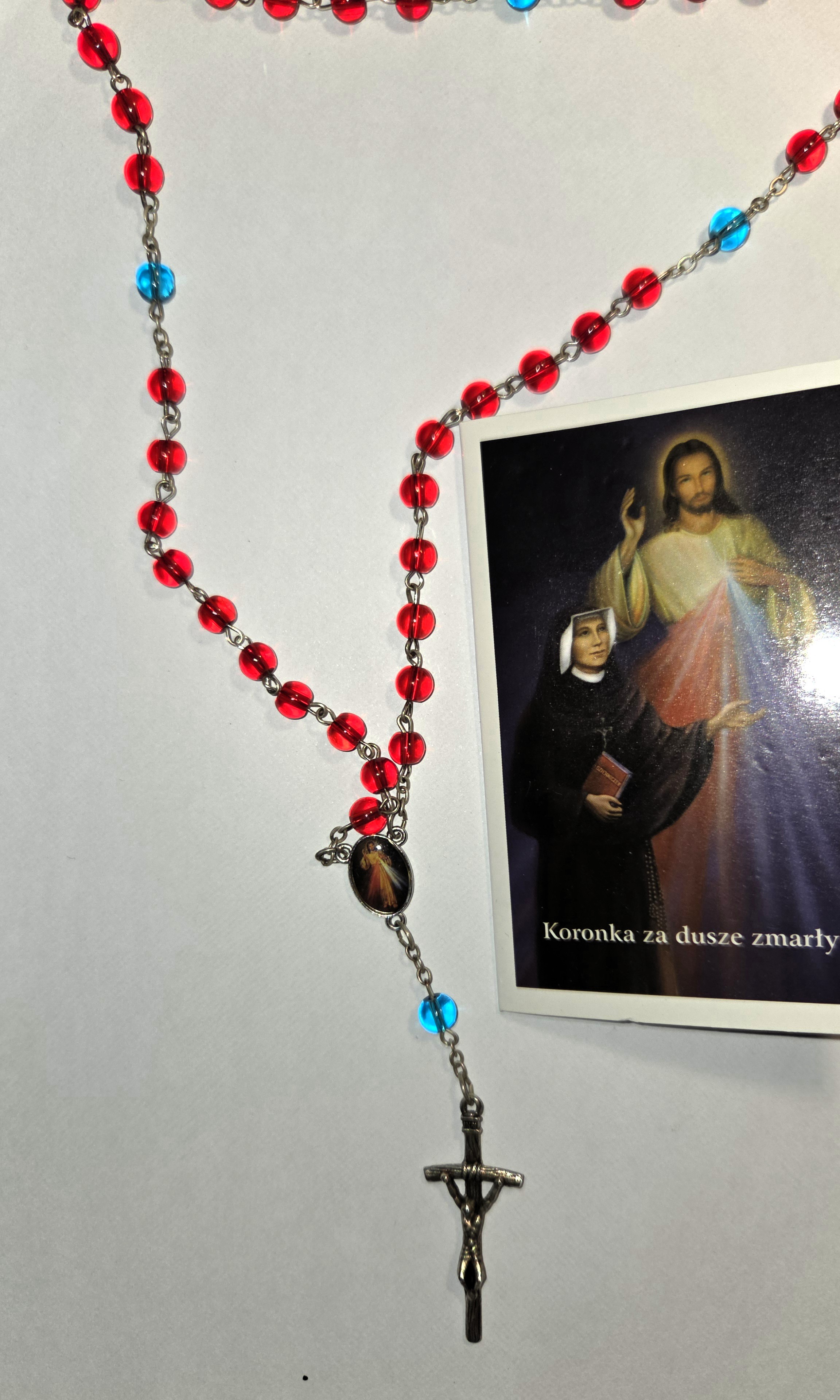 Koronka za dusze zmarłych. Paciorki czerwone i niebieskie, szklane, przezroczyste.