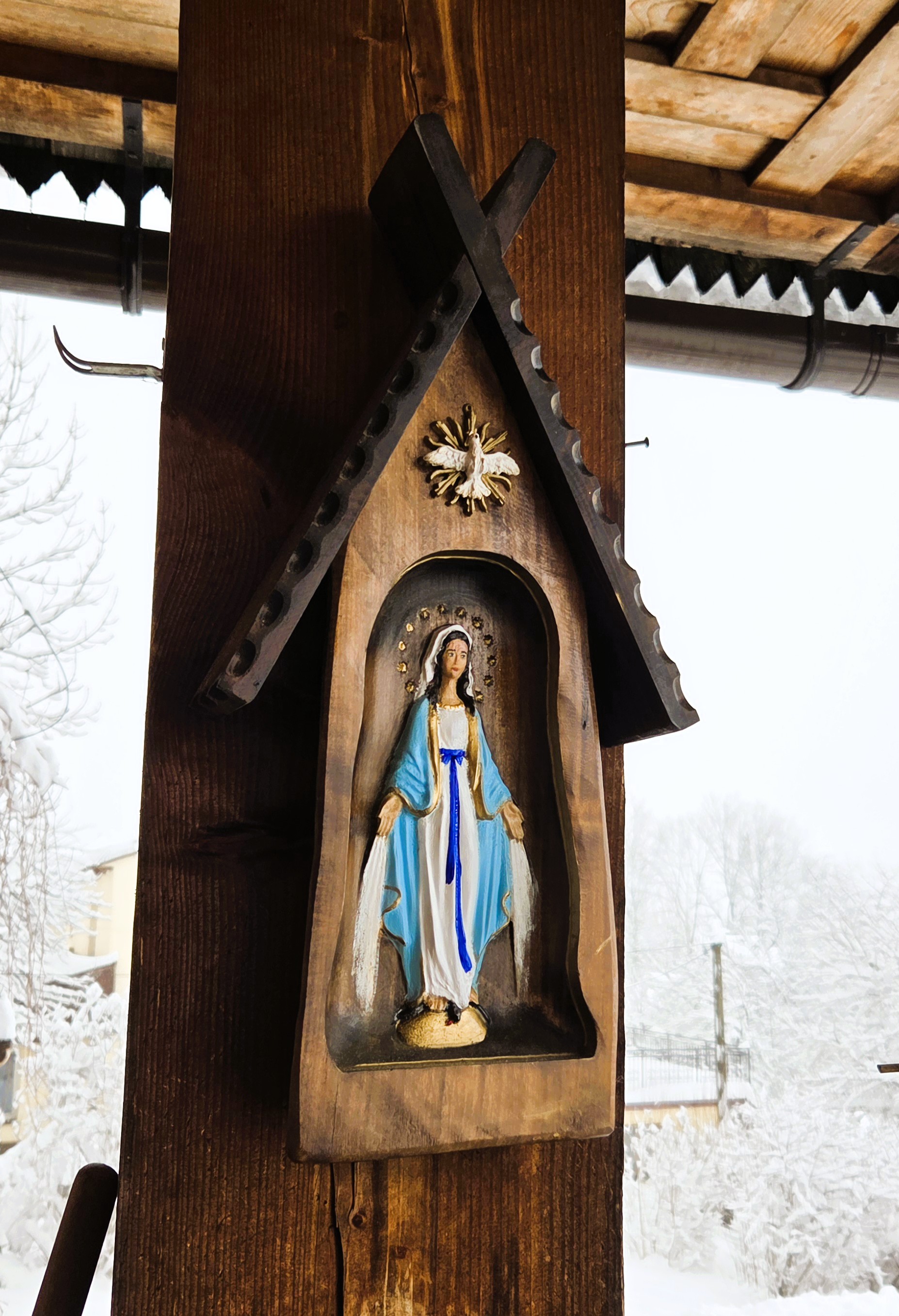 Kapliczka jest ręcznie wykonana z kłody drewna bukowego. Figura Matki Bożej pomalowana farbami olejnymi. Całość jest solidnie zaimpregnowana - nadaje się na zewnątrz.