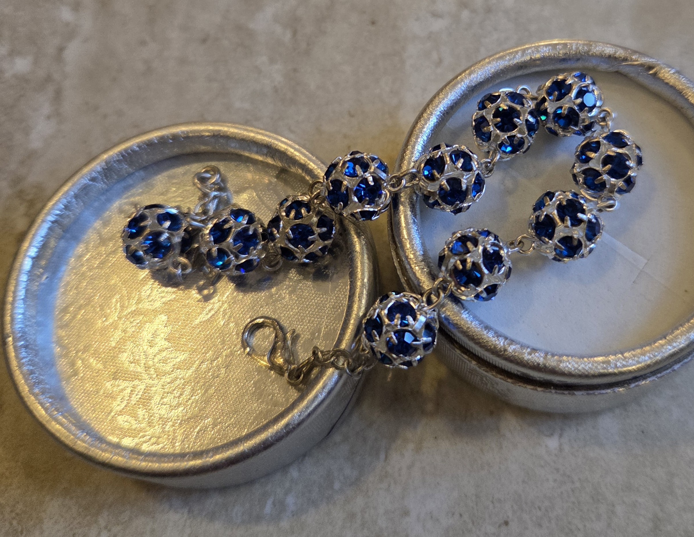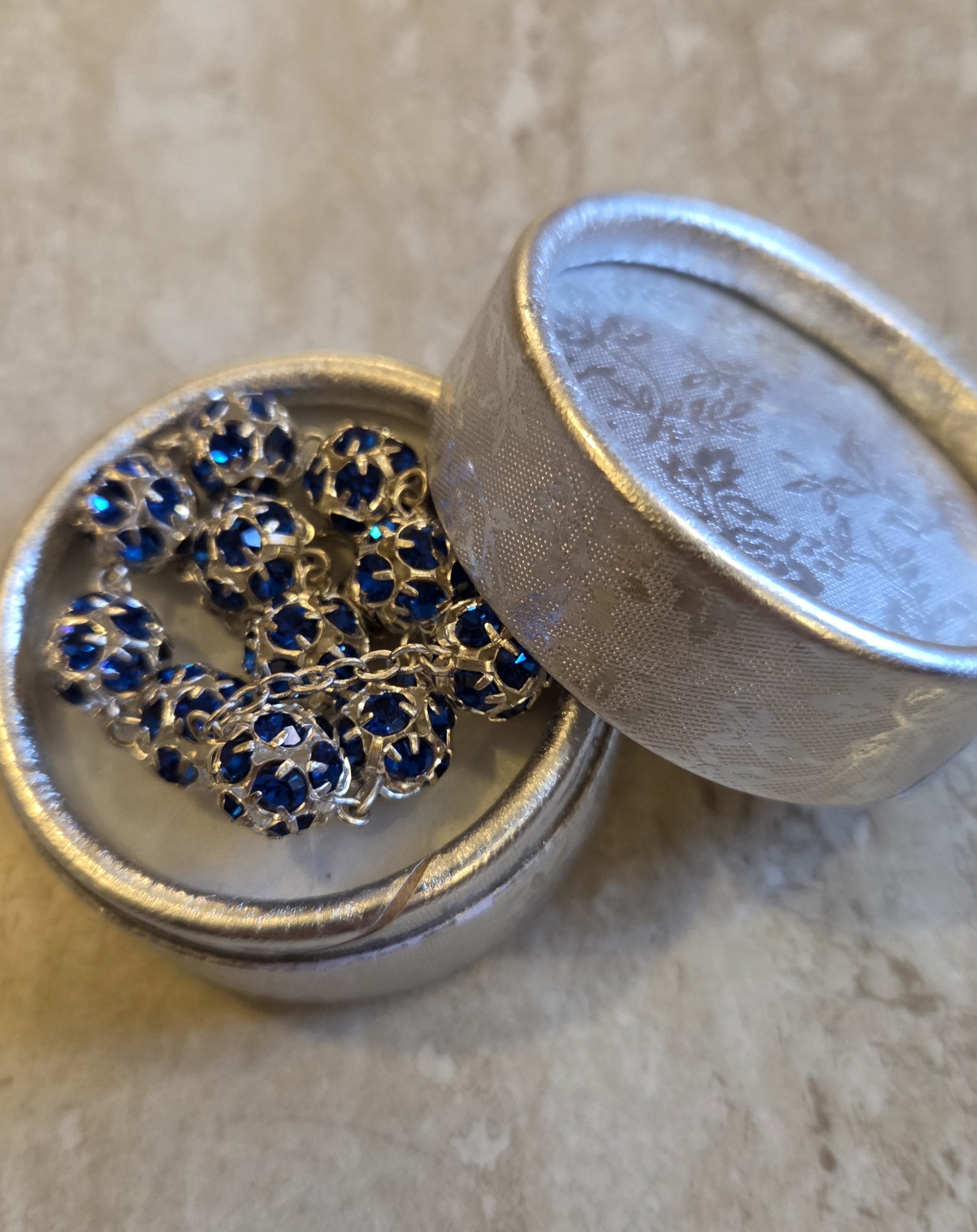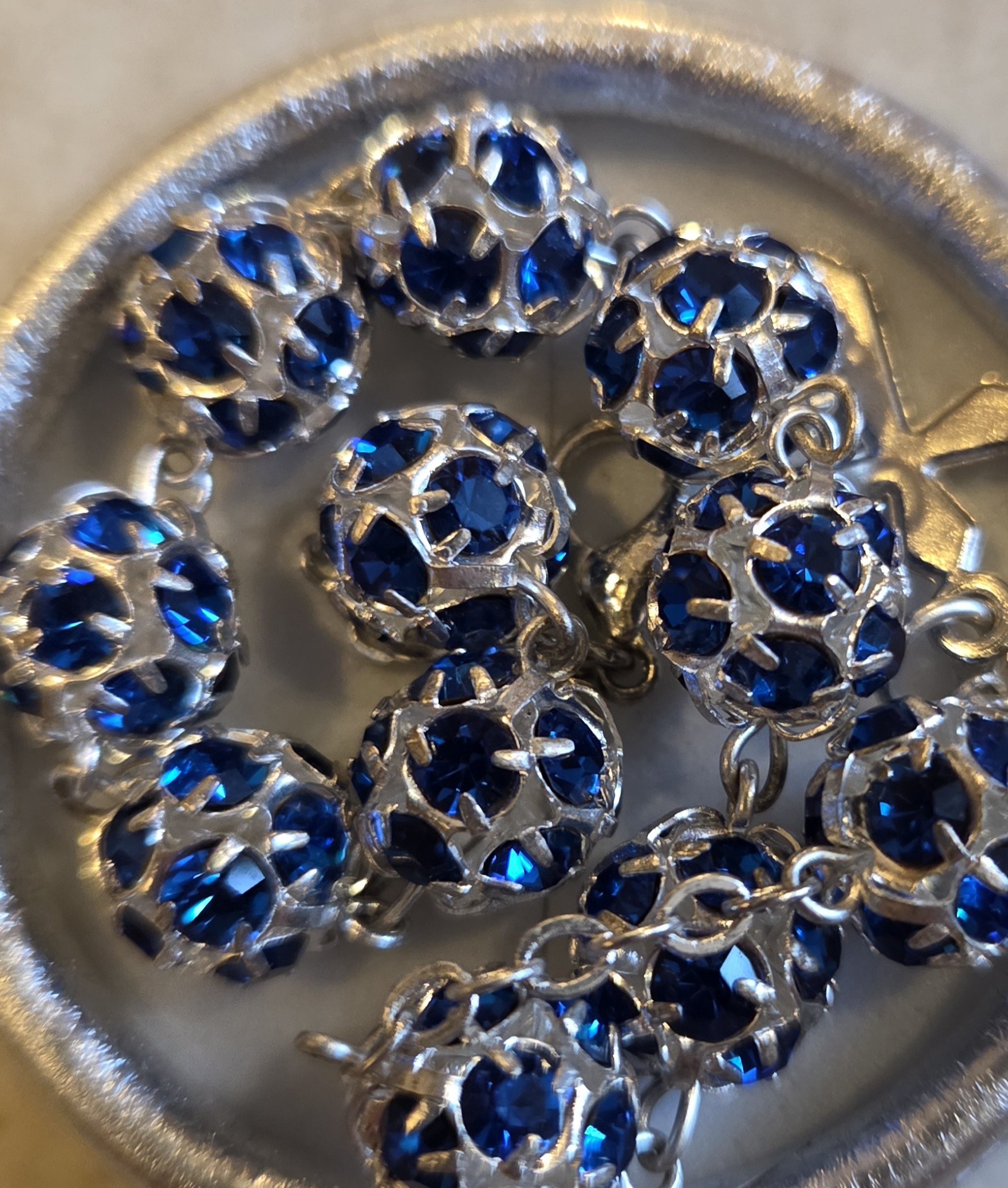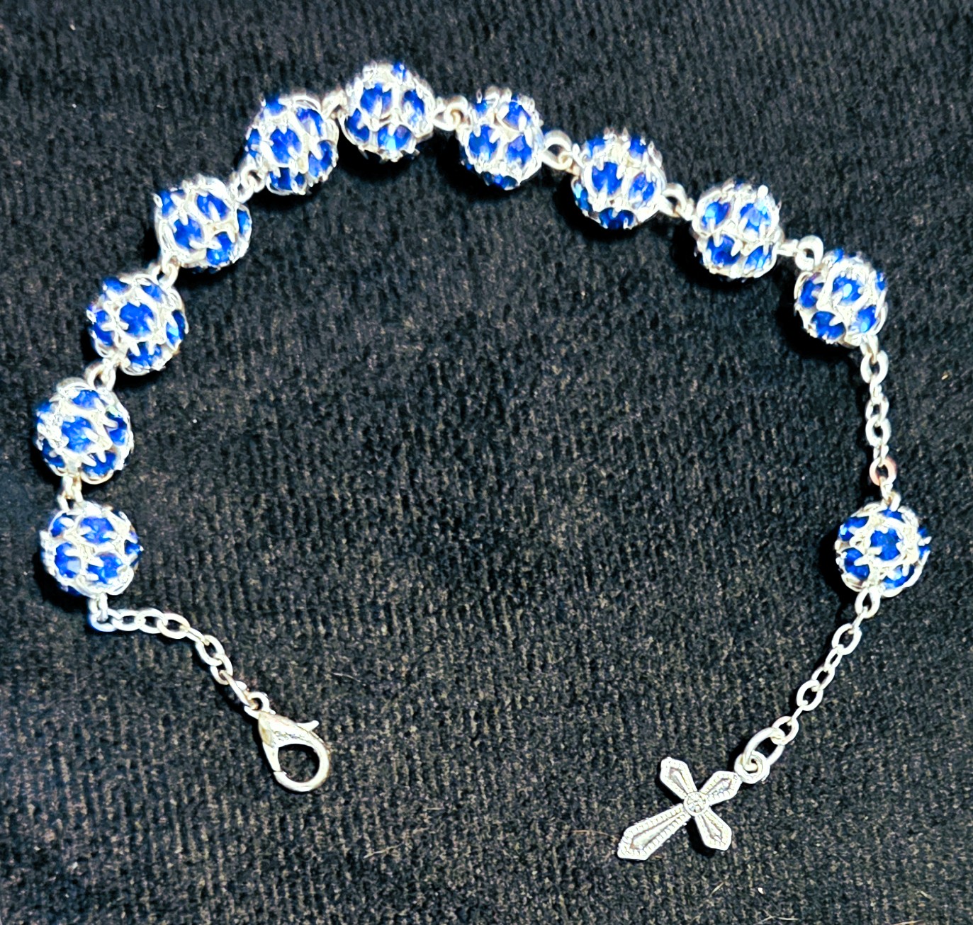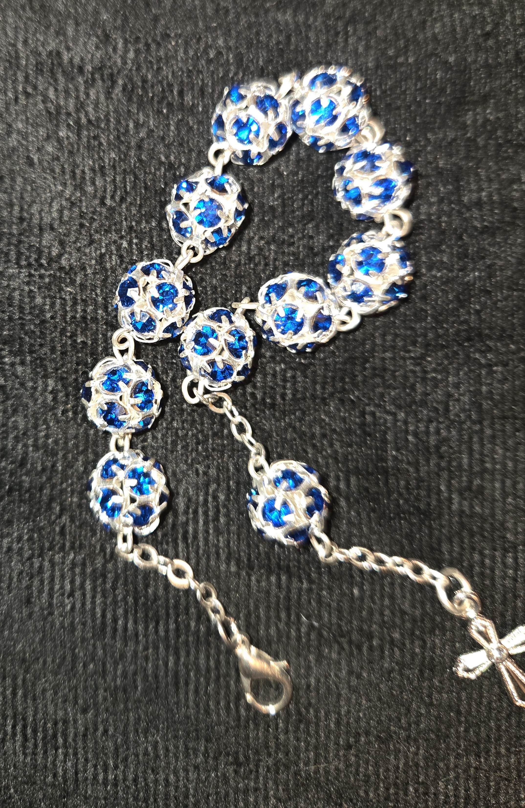 Bransoletka - dziesiątka różańca, na łańcuszku. Wykonana z kryształków Swarovskiego, w kolorze szafirowym. Średnica paciorków 1 cm.