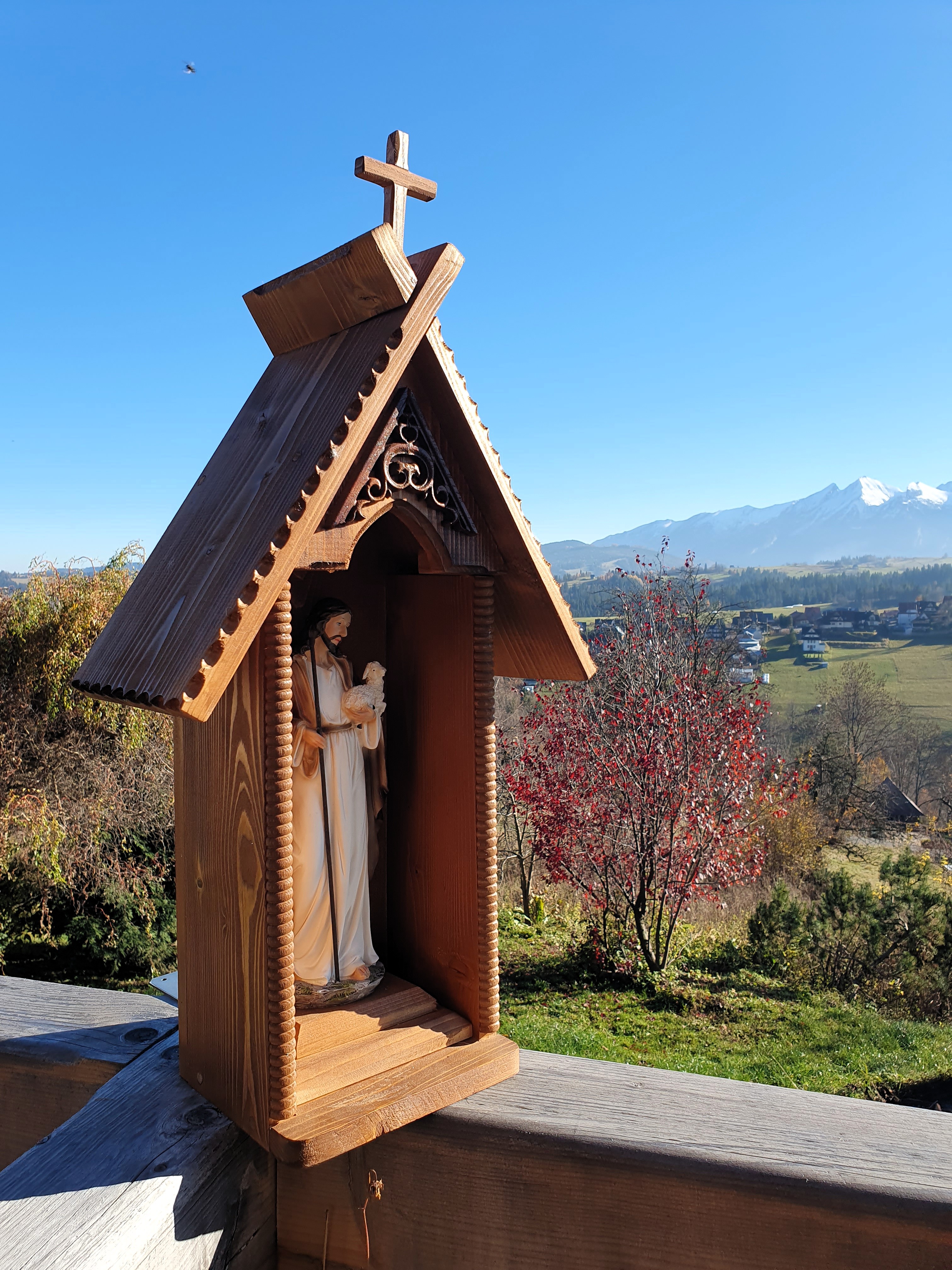 Kapliczka ogrodowa, drewniana, ręcznie wykonana (tradycyjne metody stolarskie i snycerskie).