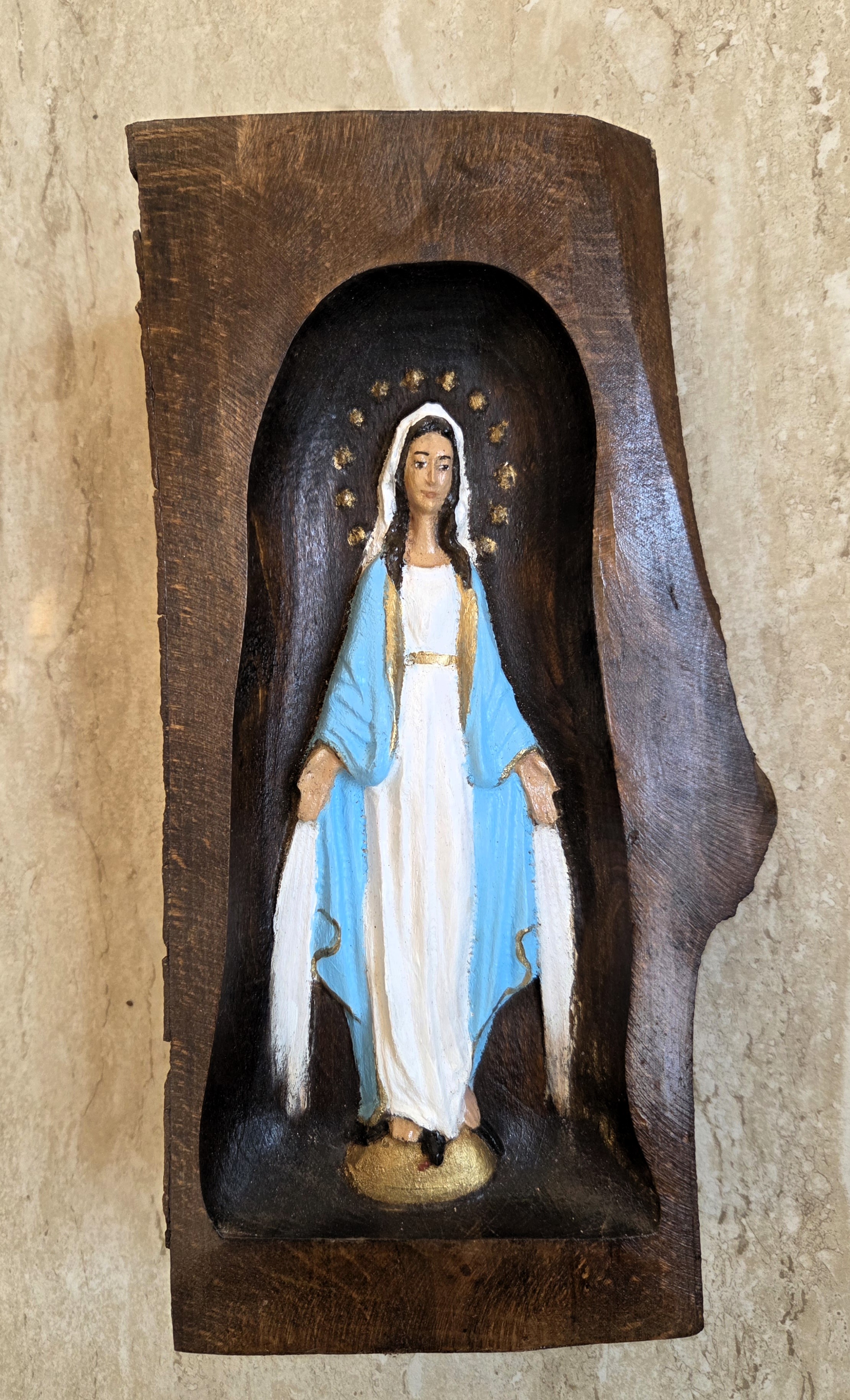 Matka Boża Niepokalana - rzeźba w drewnie, pomalowana. Rękodzieło artystyczne.