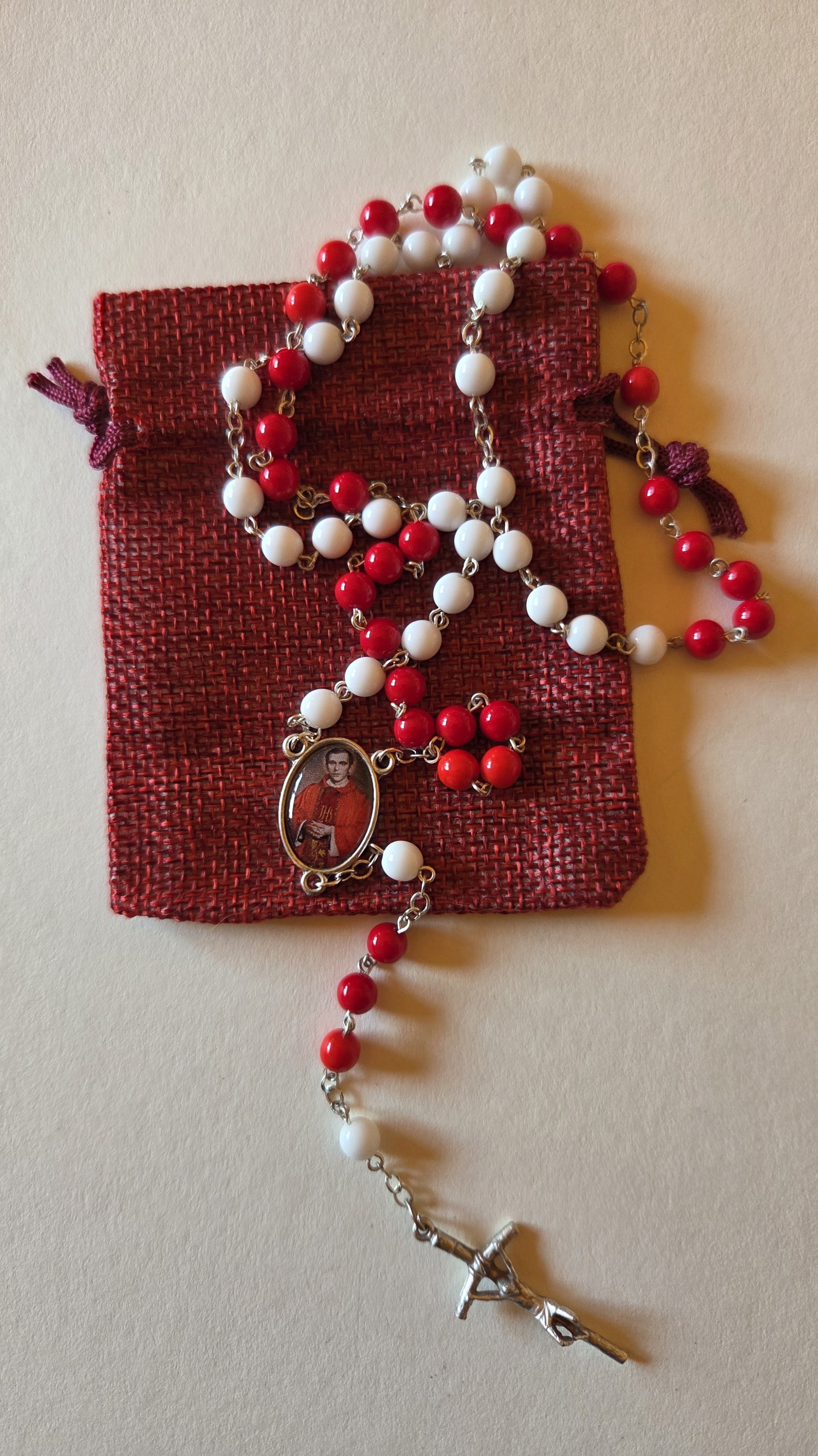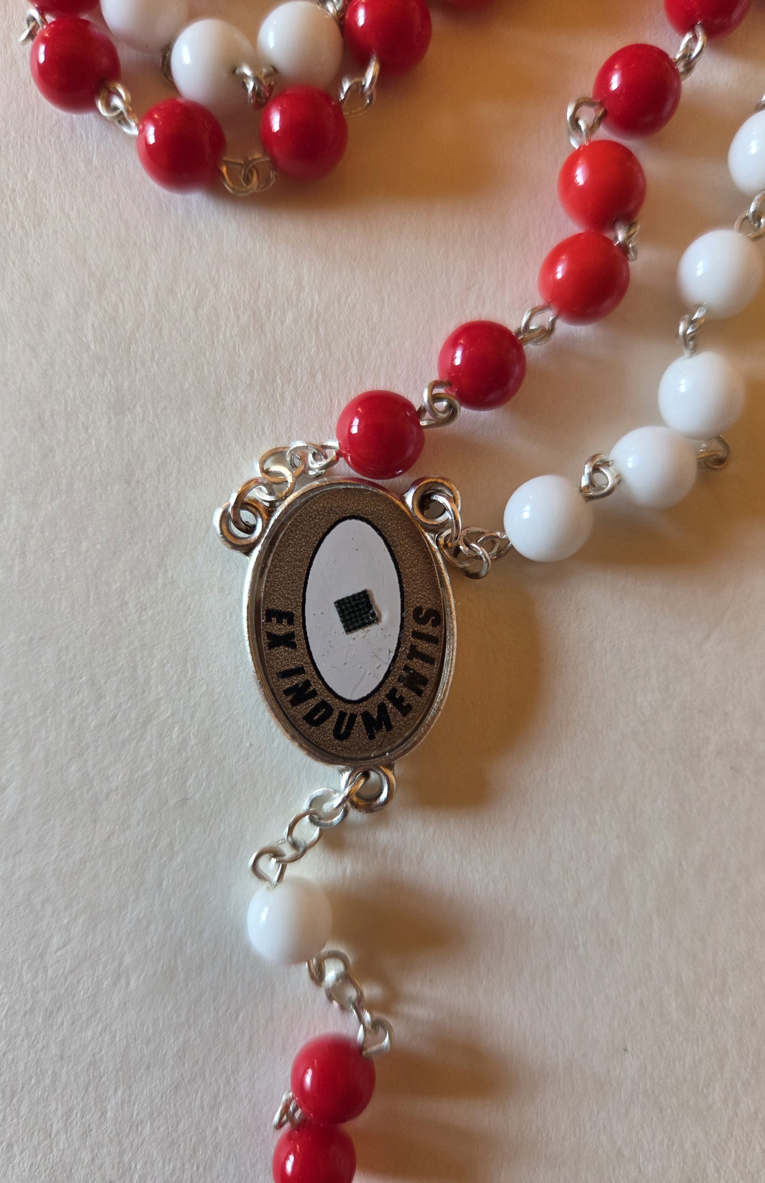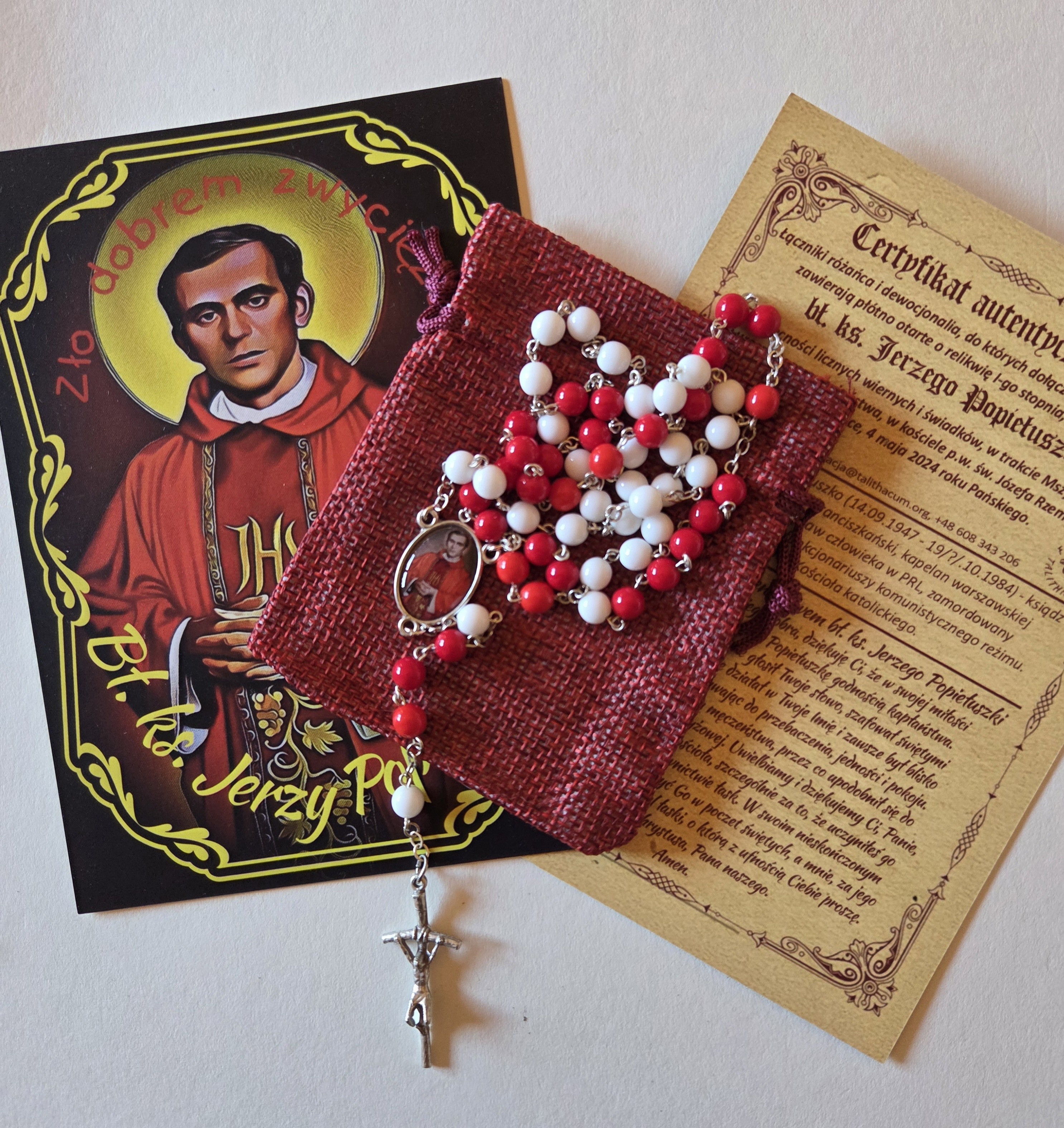 Różaniec z relikwią bł. ks. Jerzego Popiełuszki. Białoczerwone paciorki. W komplecie saszetka na różaniec i certyfikat autentyczności.
