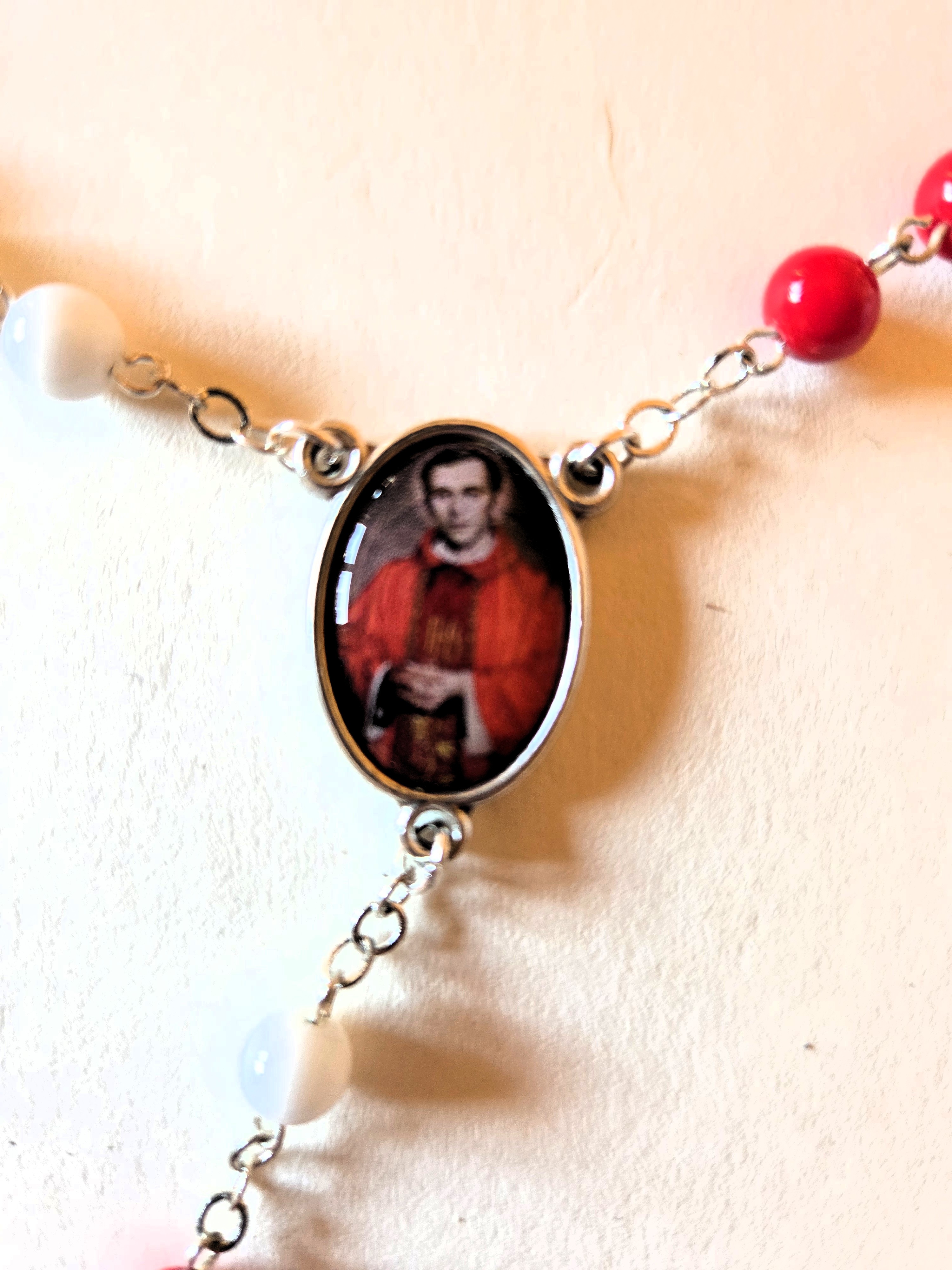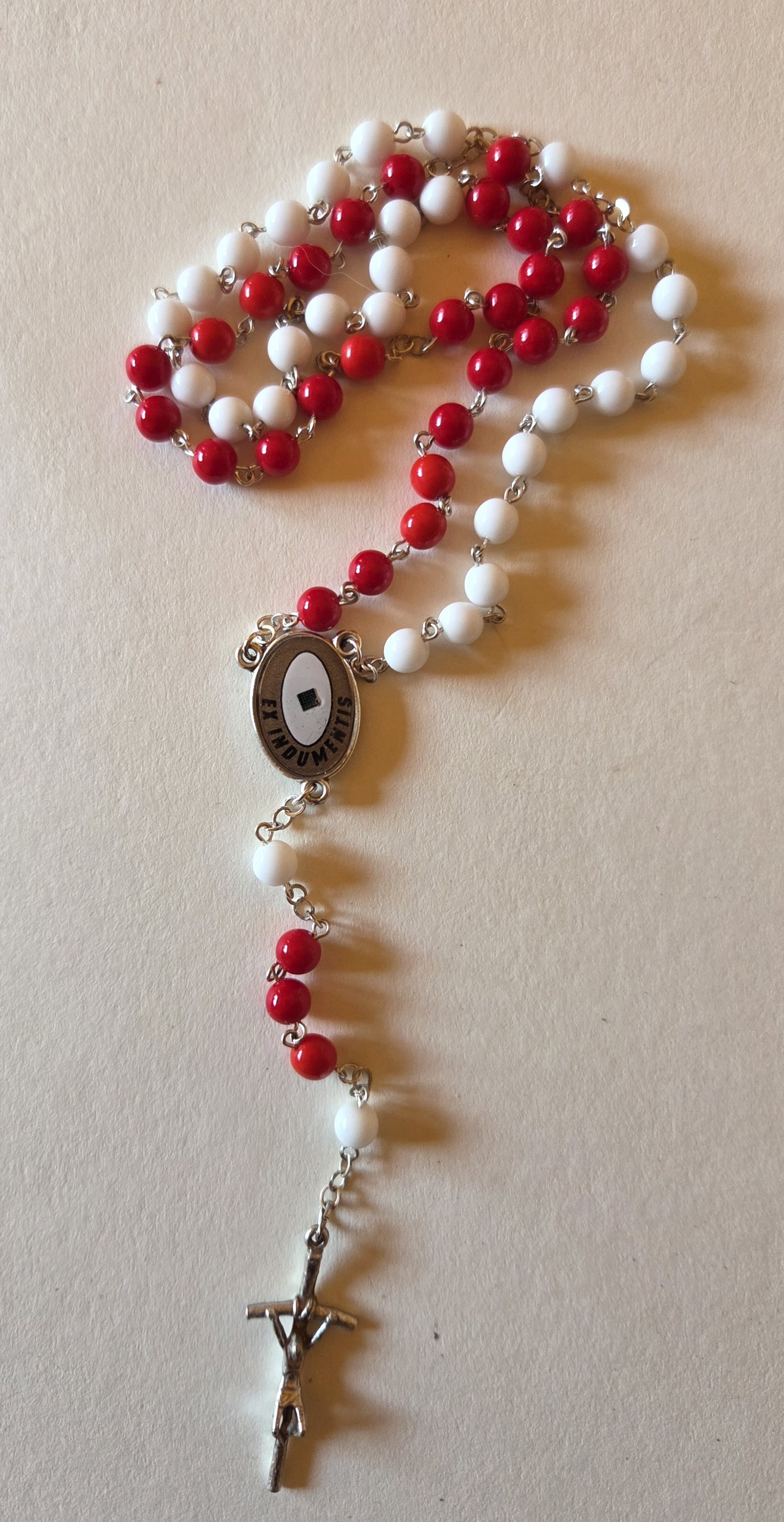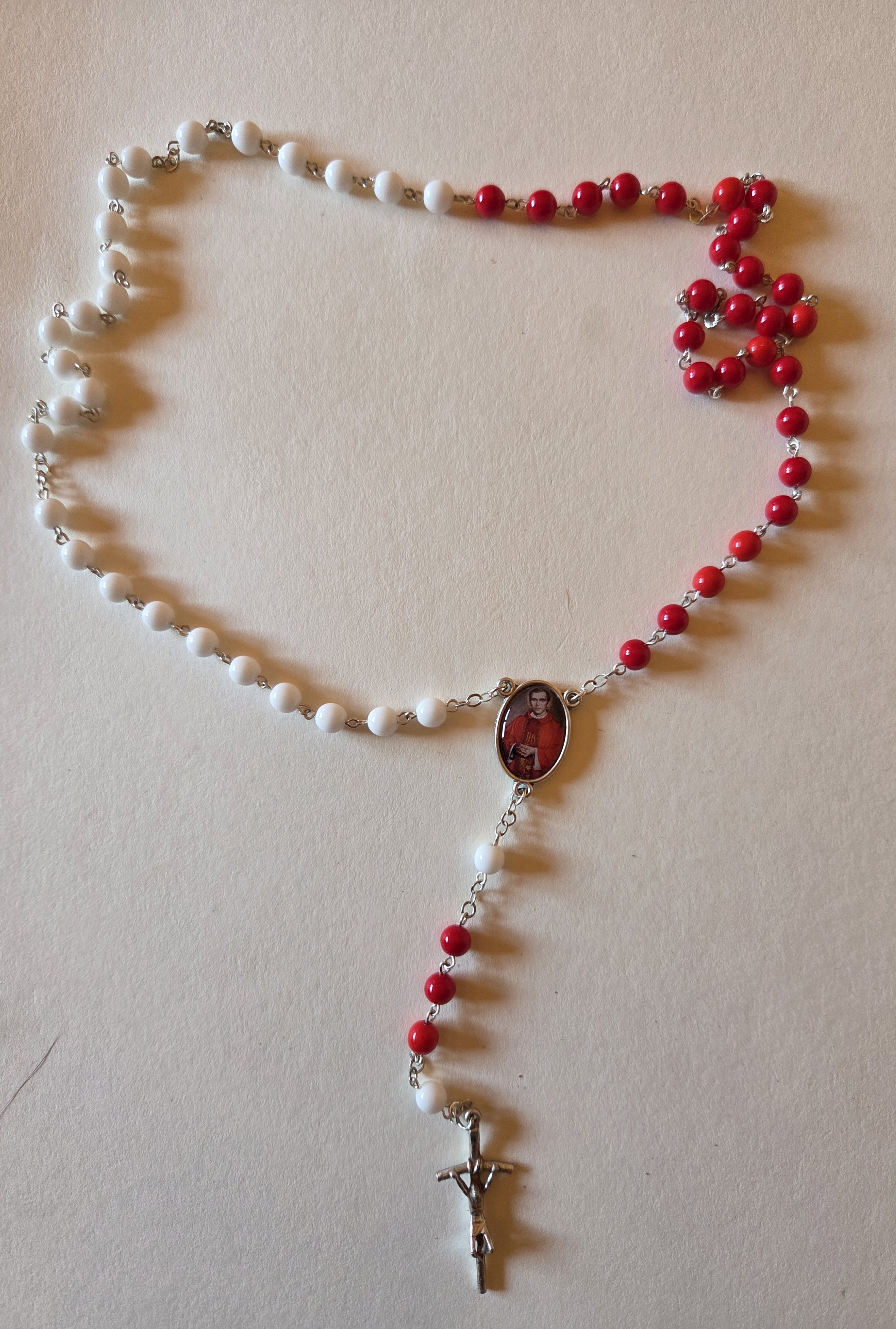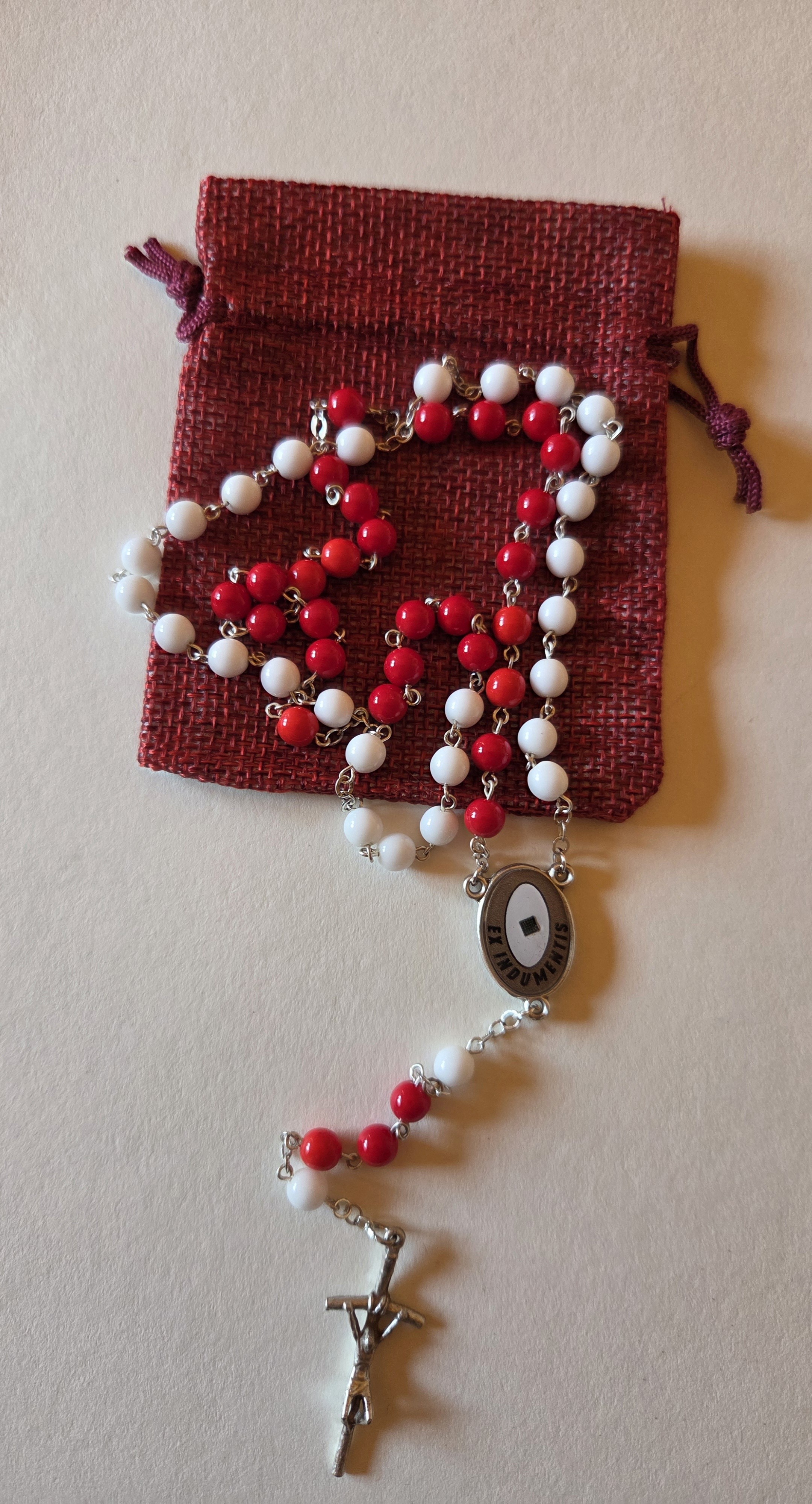 Różaniec z relikwią bł. ks. Jerzego Popiełuszki. Białoczerwone paciorki. W komplecie saszetka na różaniec i certyfikat autentyczności.