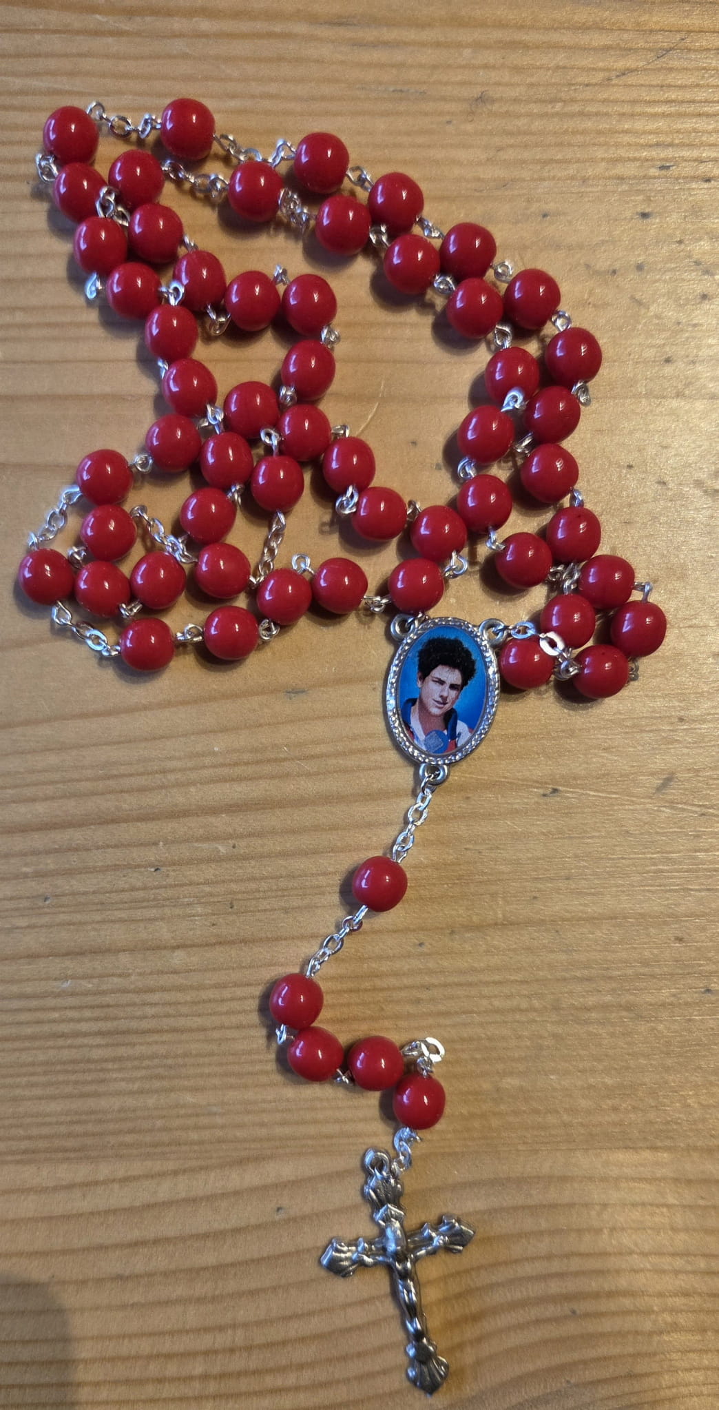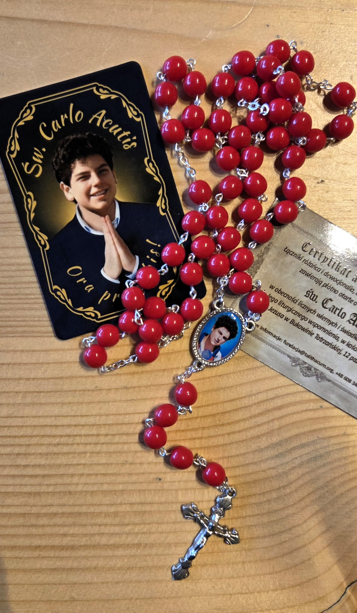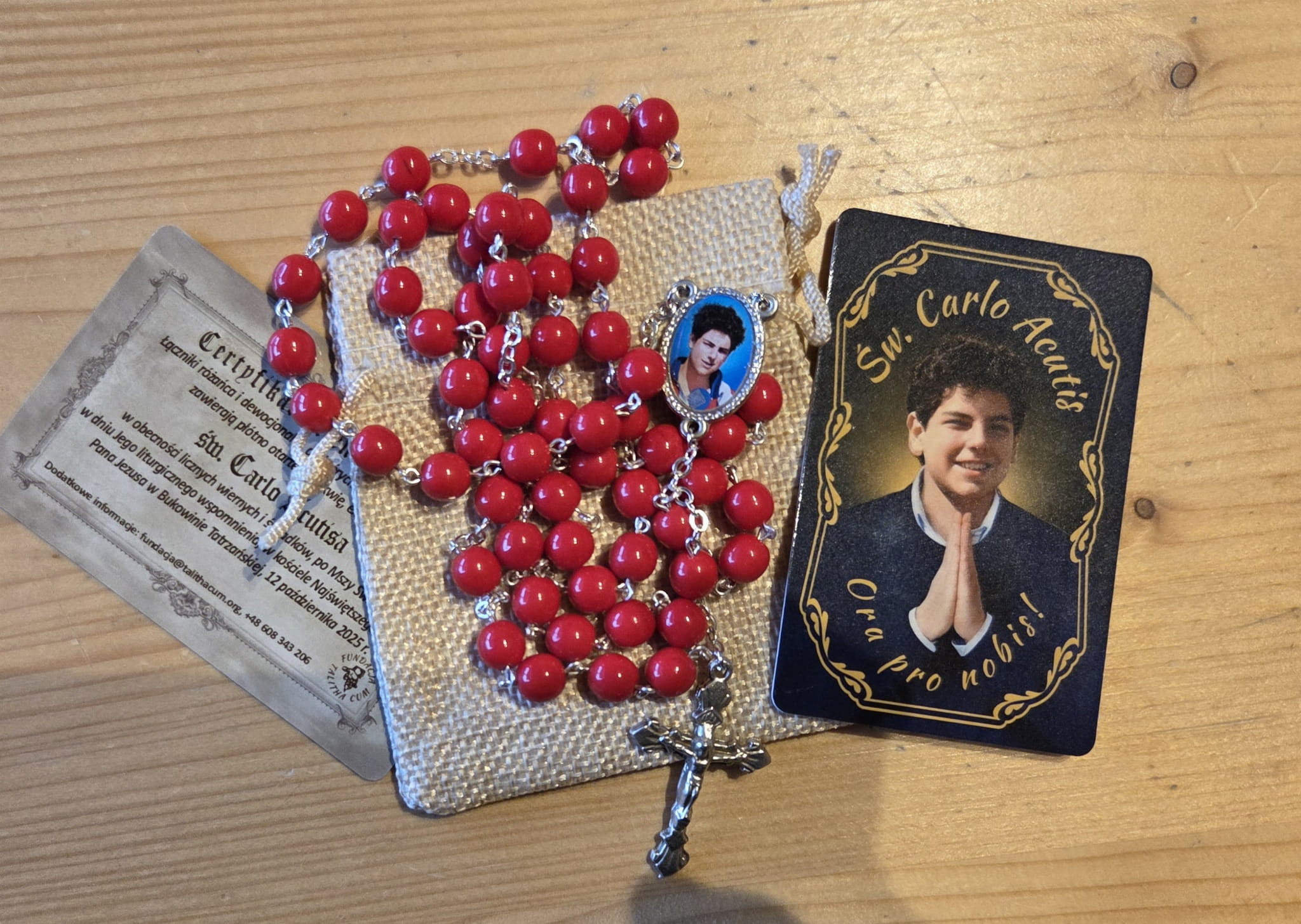 Śliczny czerwony różaniec z relikwią III stopnia Carlo Acutisa.