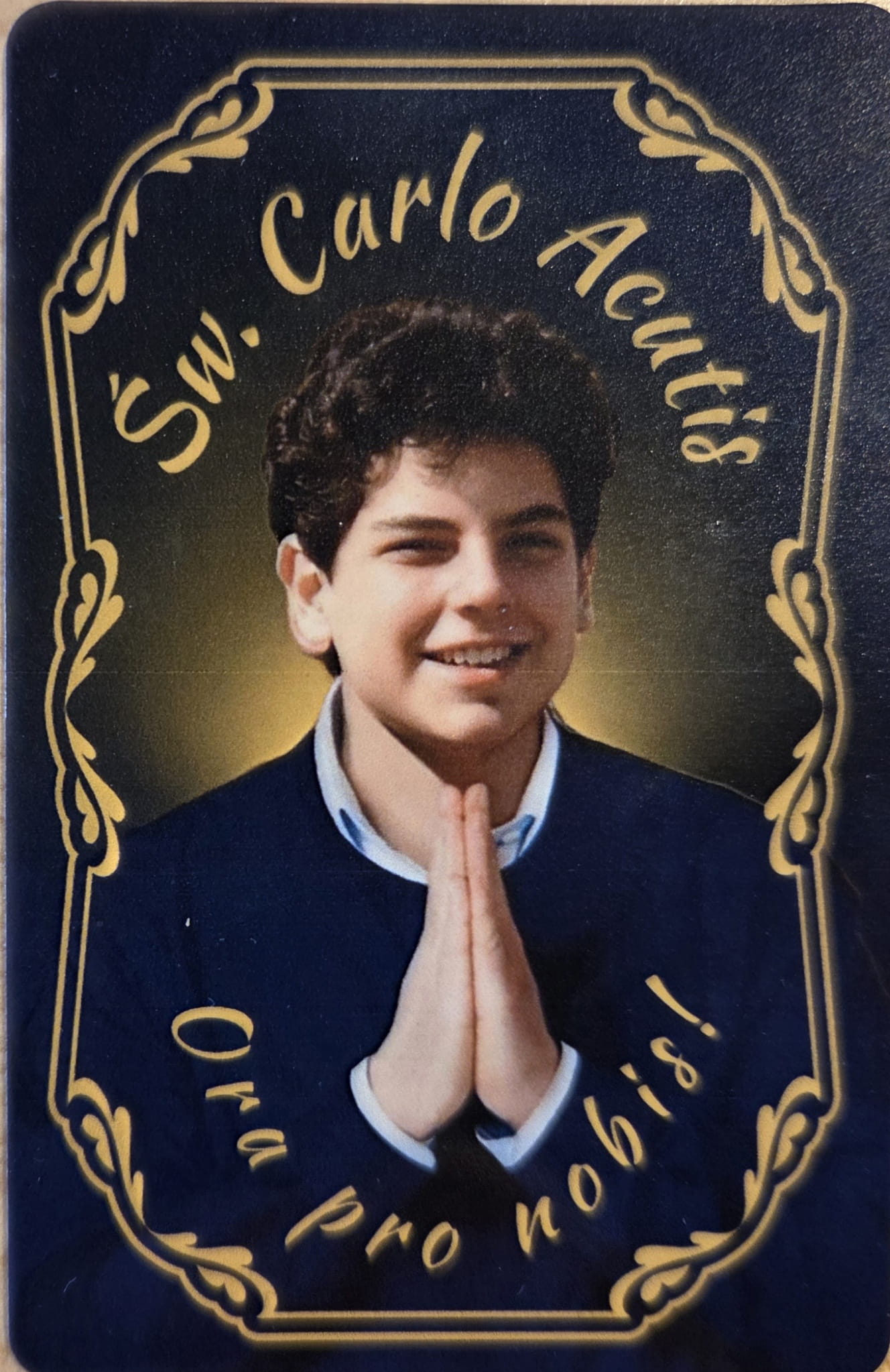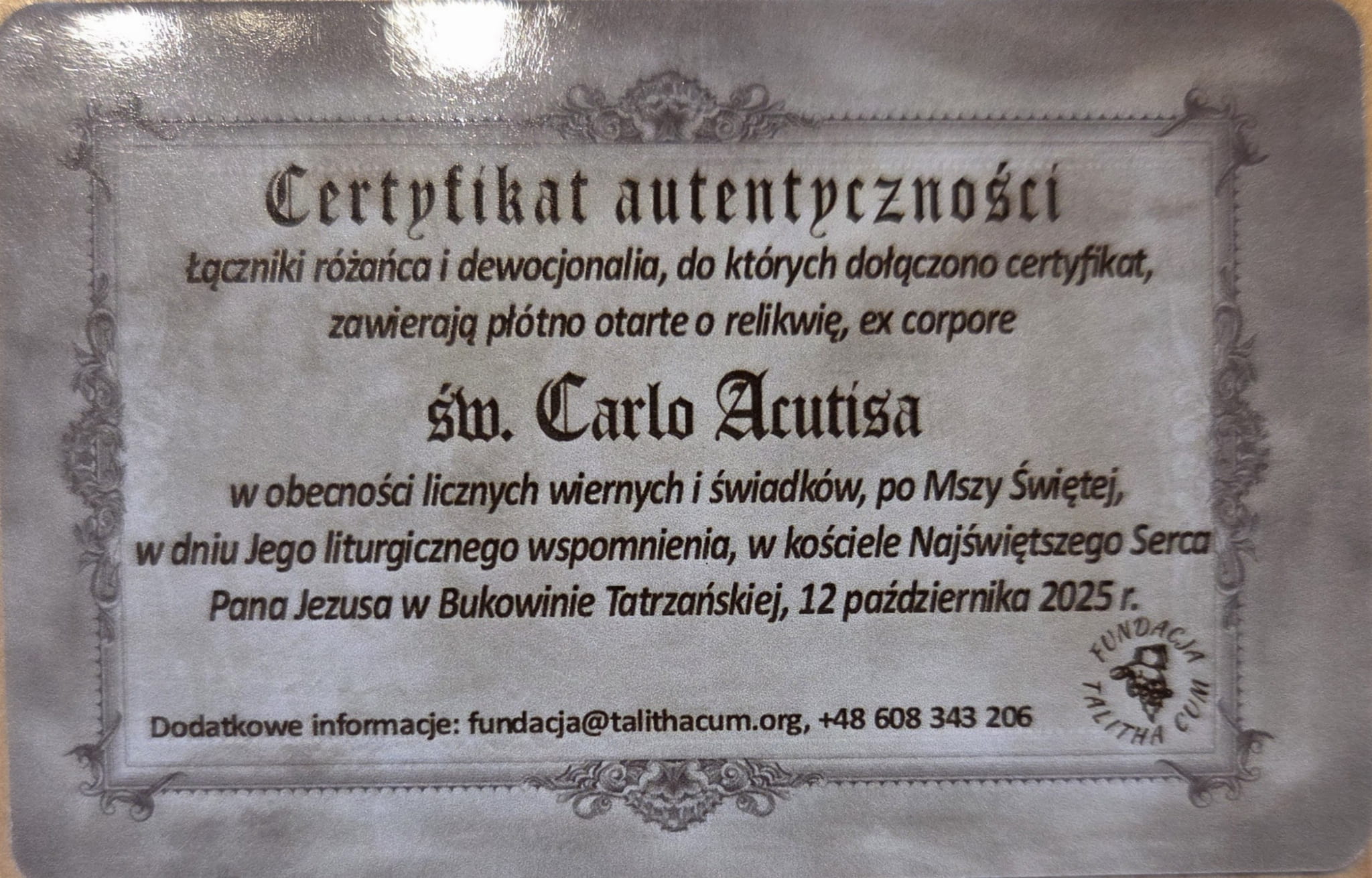 W metalowym łączniku różańca znajduje się materiał potarty o relikwię I stopnia Świętego Carlo Acutisa, pobłogosławionyo i poświęcony podczas specjalnego nabożeństwa, w obecności wiernych i świadków, co zostało potwierdzone certyfikatem.