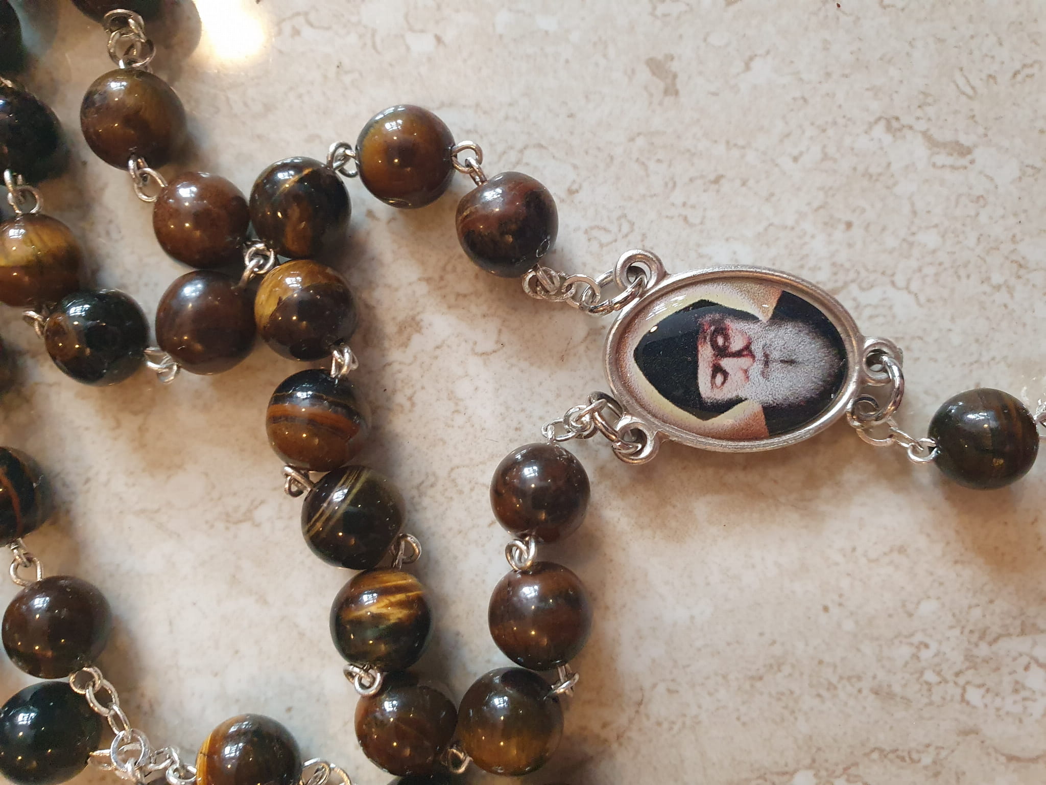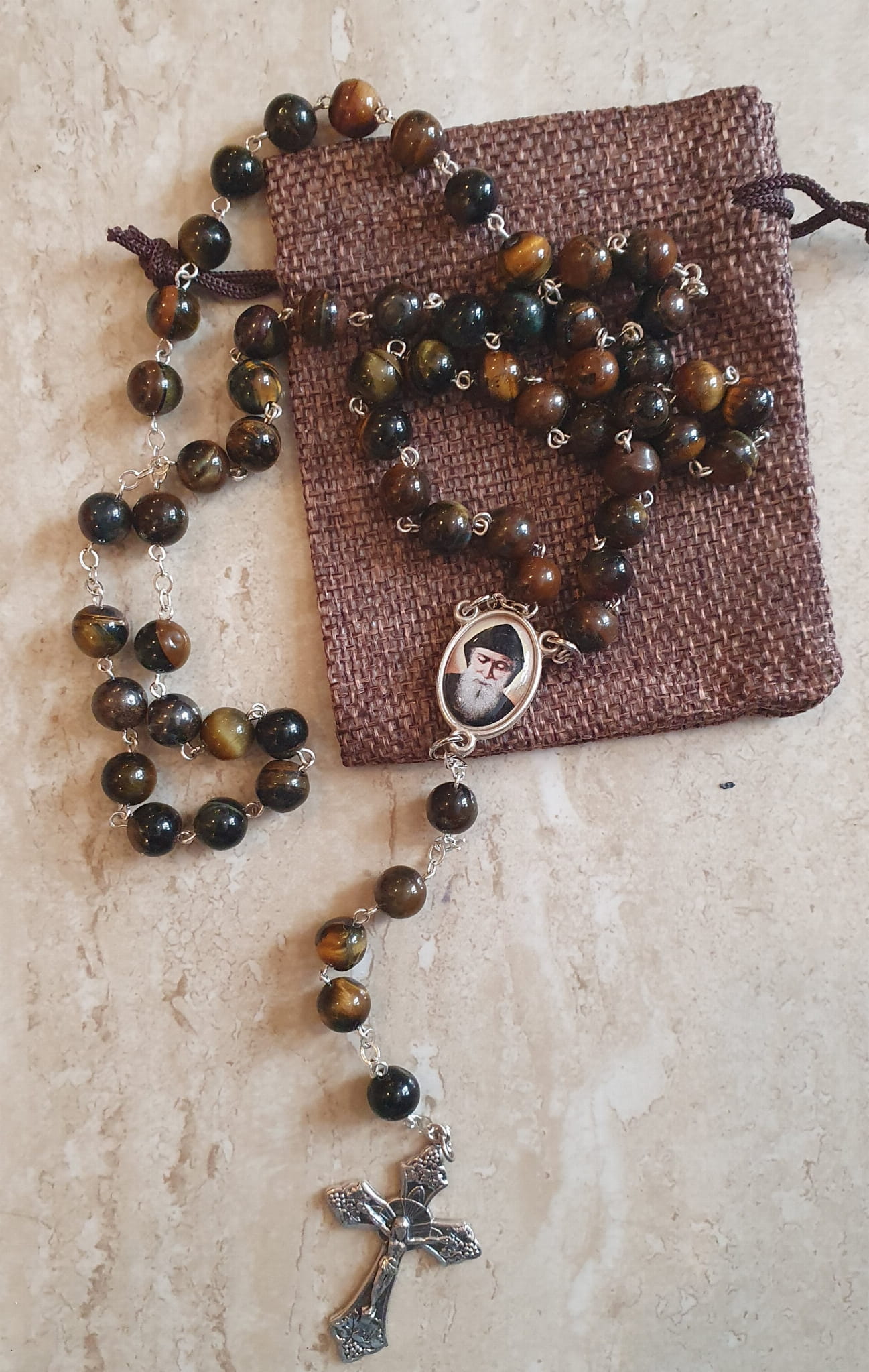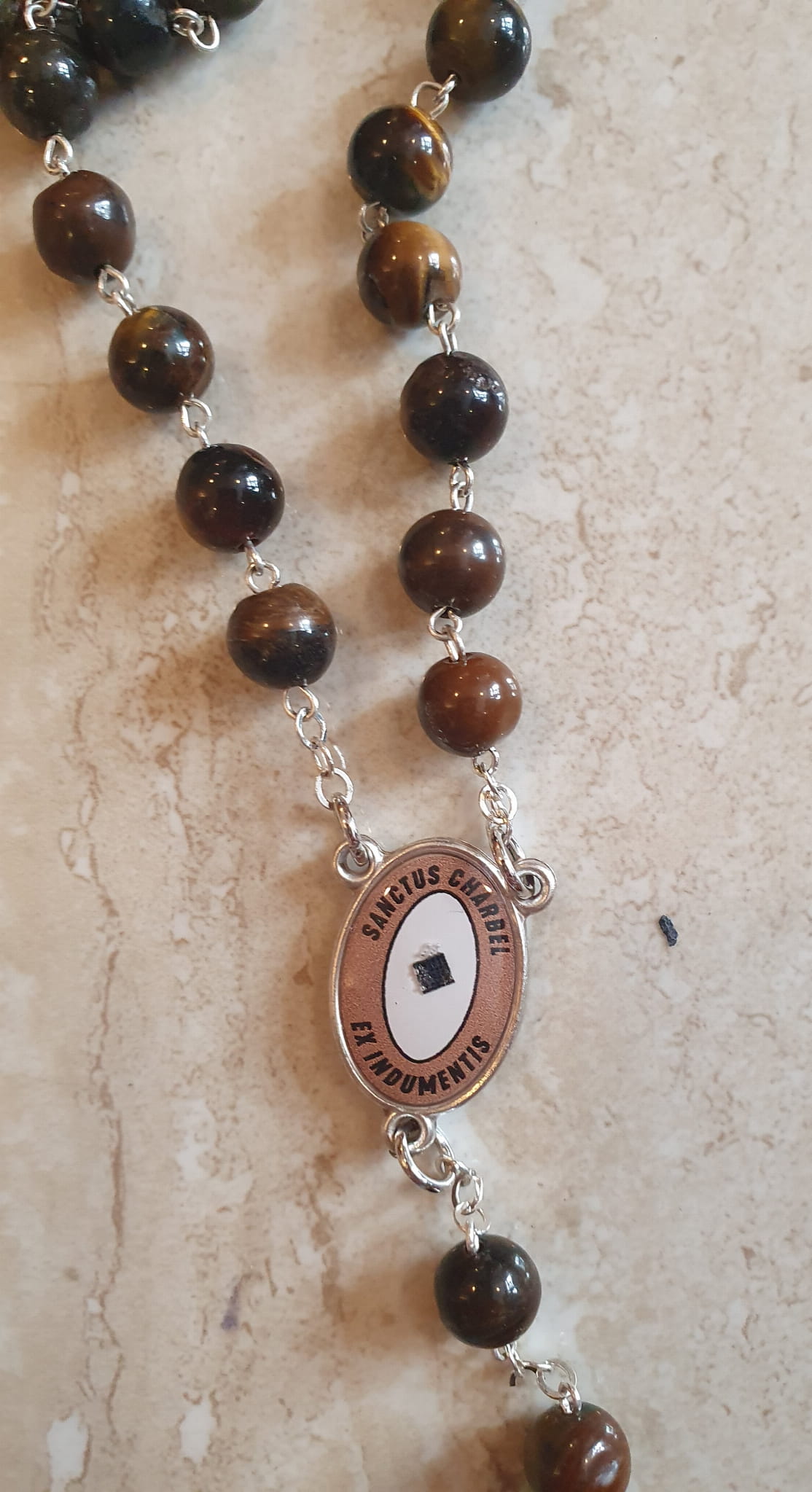 Piękny różaniec z relikwią III stopnia Świętego Charbela, wykonany z kamieni półszlachetnych zwanych "tygrysie oko".