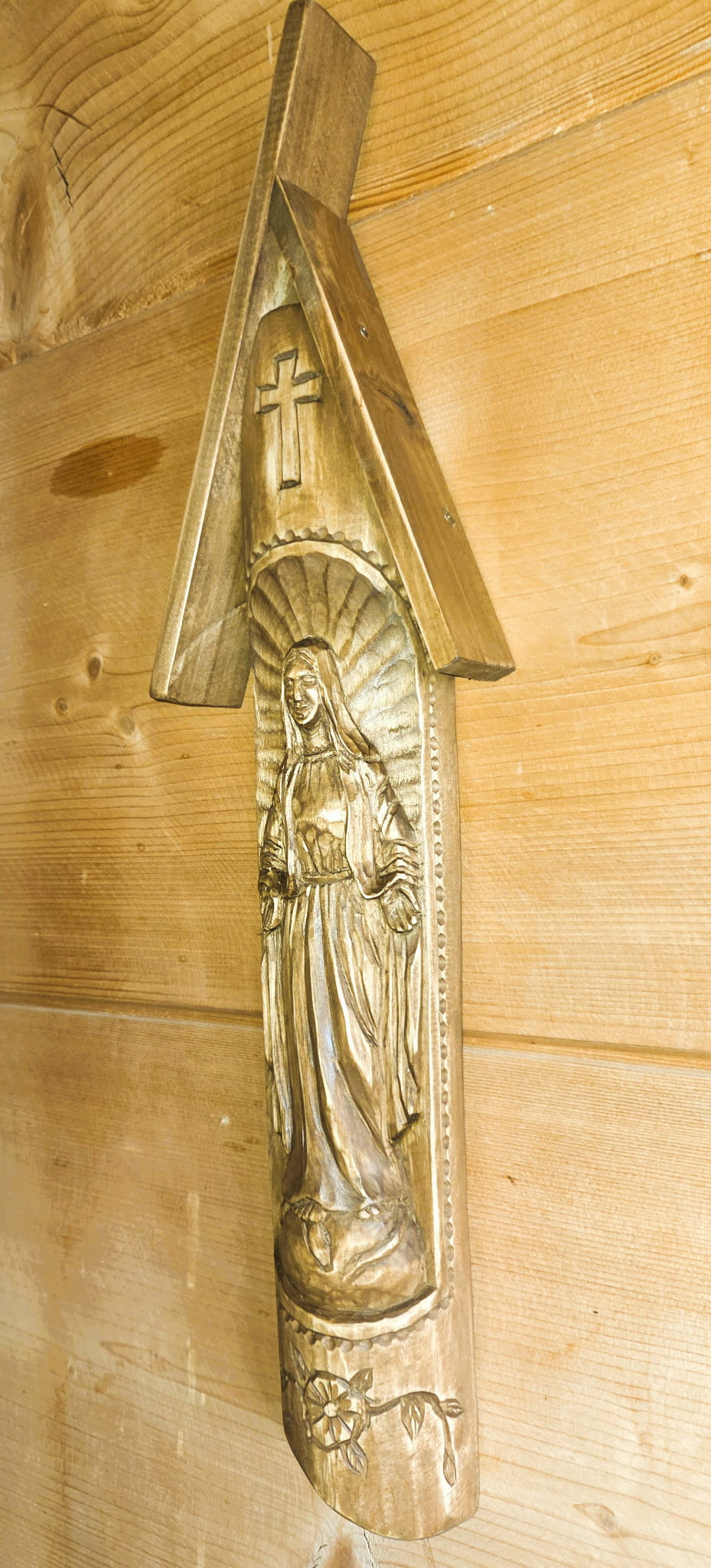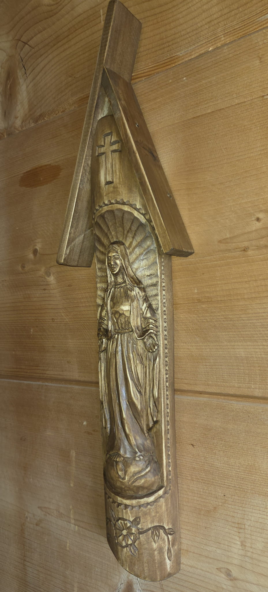 Piękna rzeźba góralska - Matka Boska w kapliczce. Wykonane z jednej lipowej kłody. Całość przykryta strzelistym daszkiem. Bardzo oryginalna rzeźba wykonana przez artystę z Podhala.