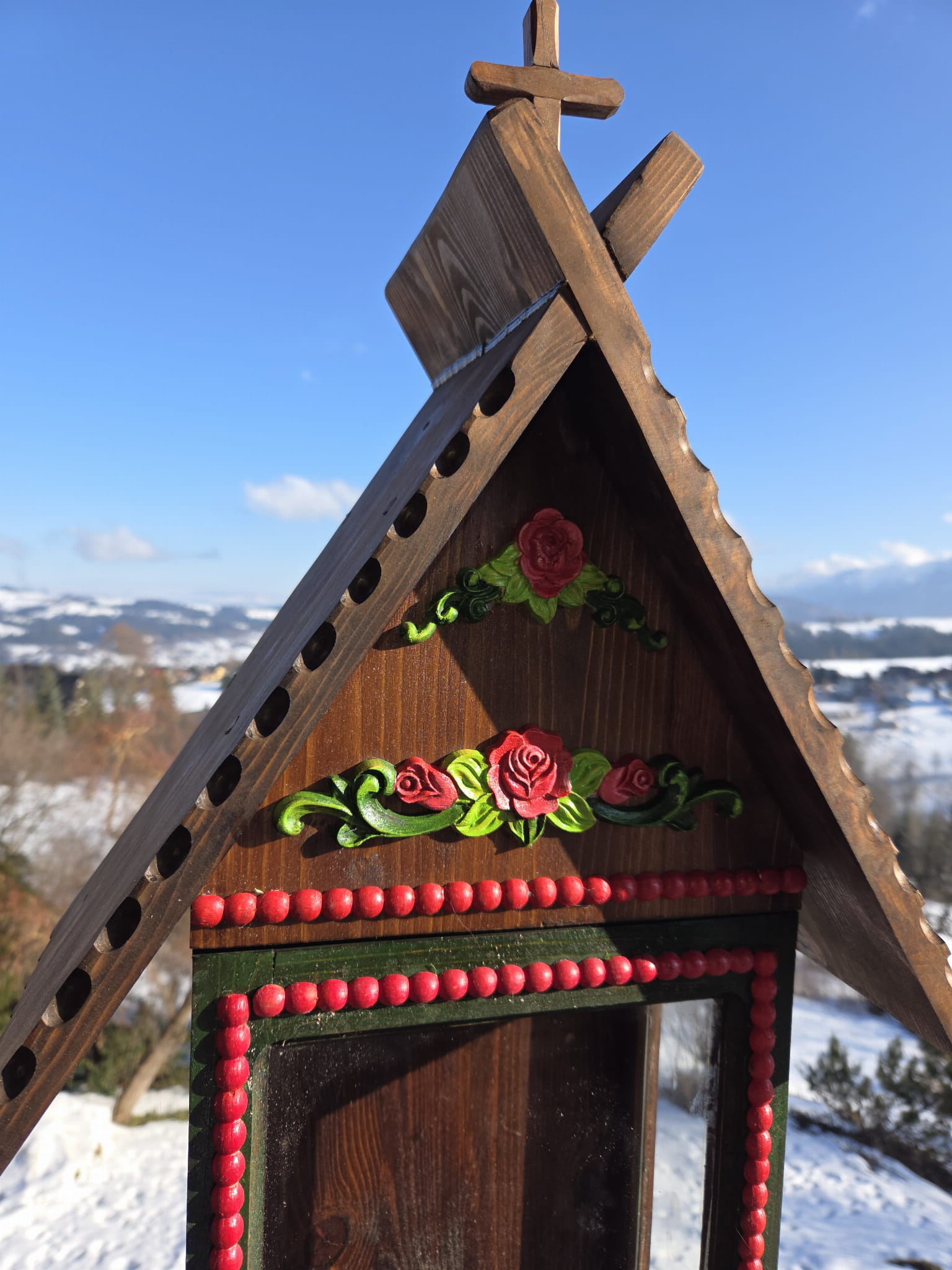 Piękna kapliczka drewniana, zamykana i przeszklona. Ozdobiona malowanymi, kwiatowymi ornamentami.