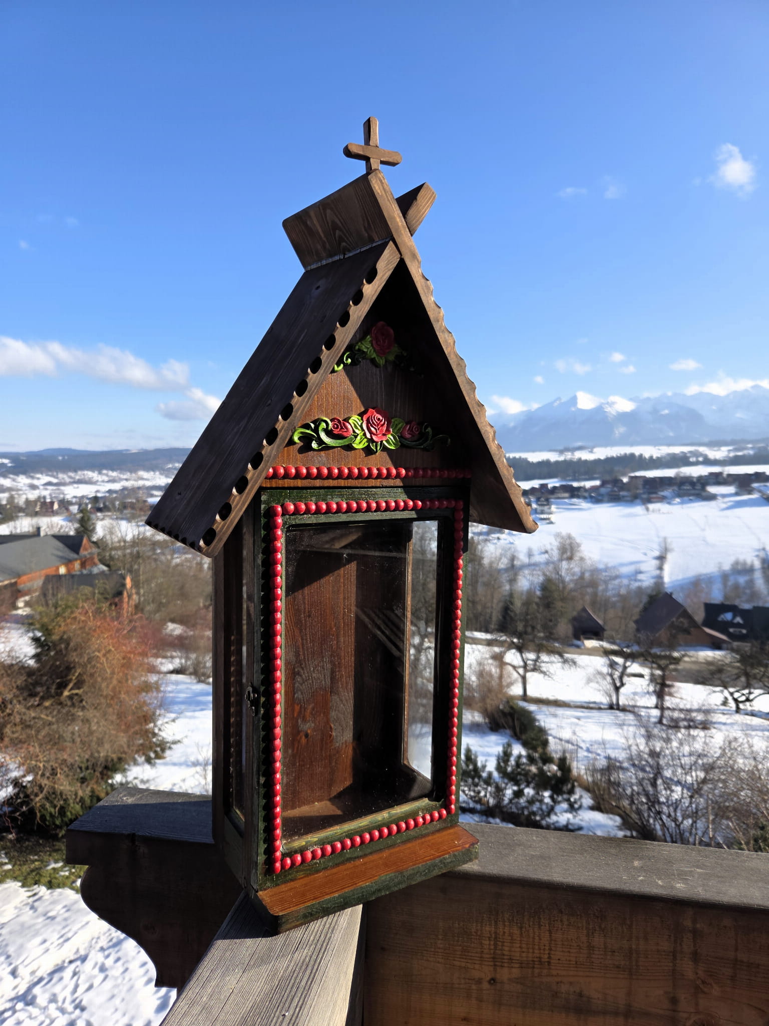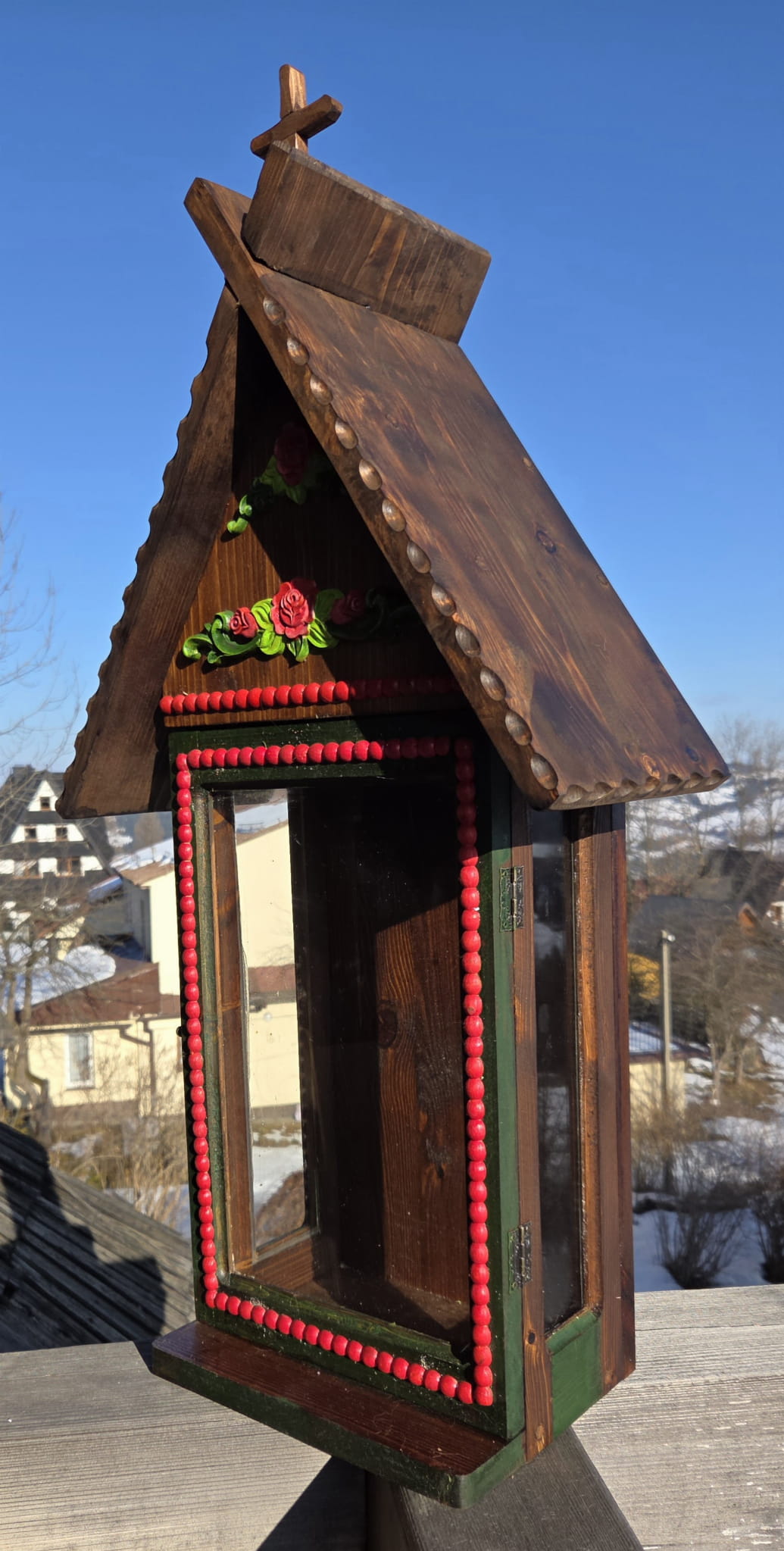 Kapliczka może być umieszczona na zewnątrz, ponieważ drewno jest specjalnie zaimpregnowane i odporne na warunki atmosferyczne.