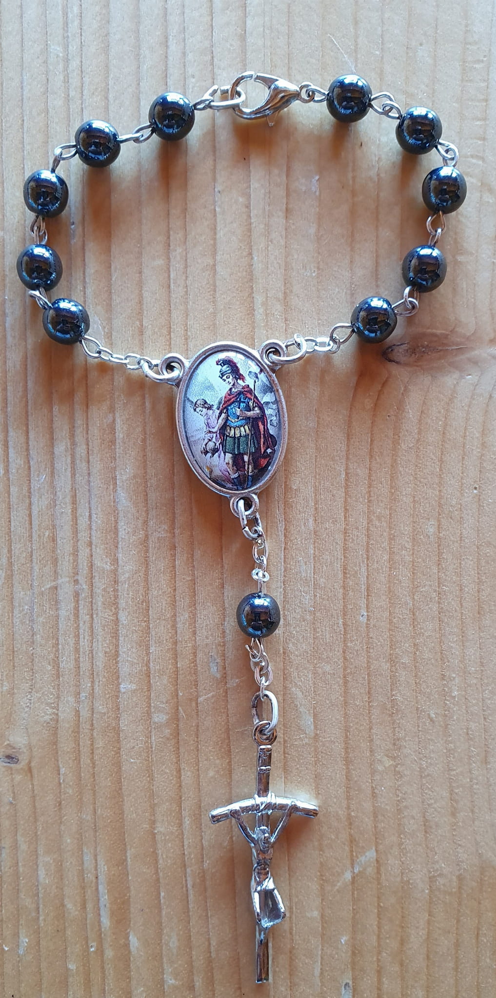 Dziesiątka różańca z relikwią III stopnia Świętego Floriana. Paciorki małe (0,5 cm) z hematytu. W komplecie certyfikat autentyczności relikwii.