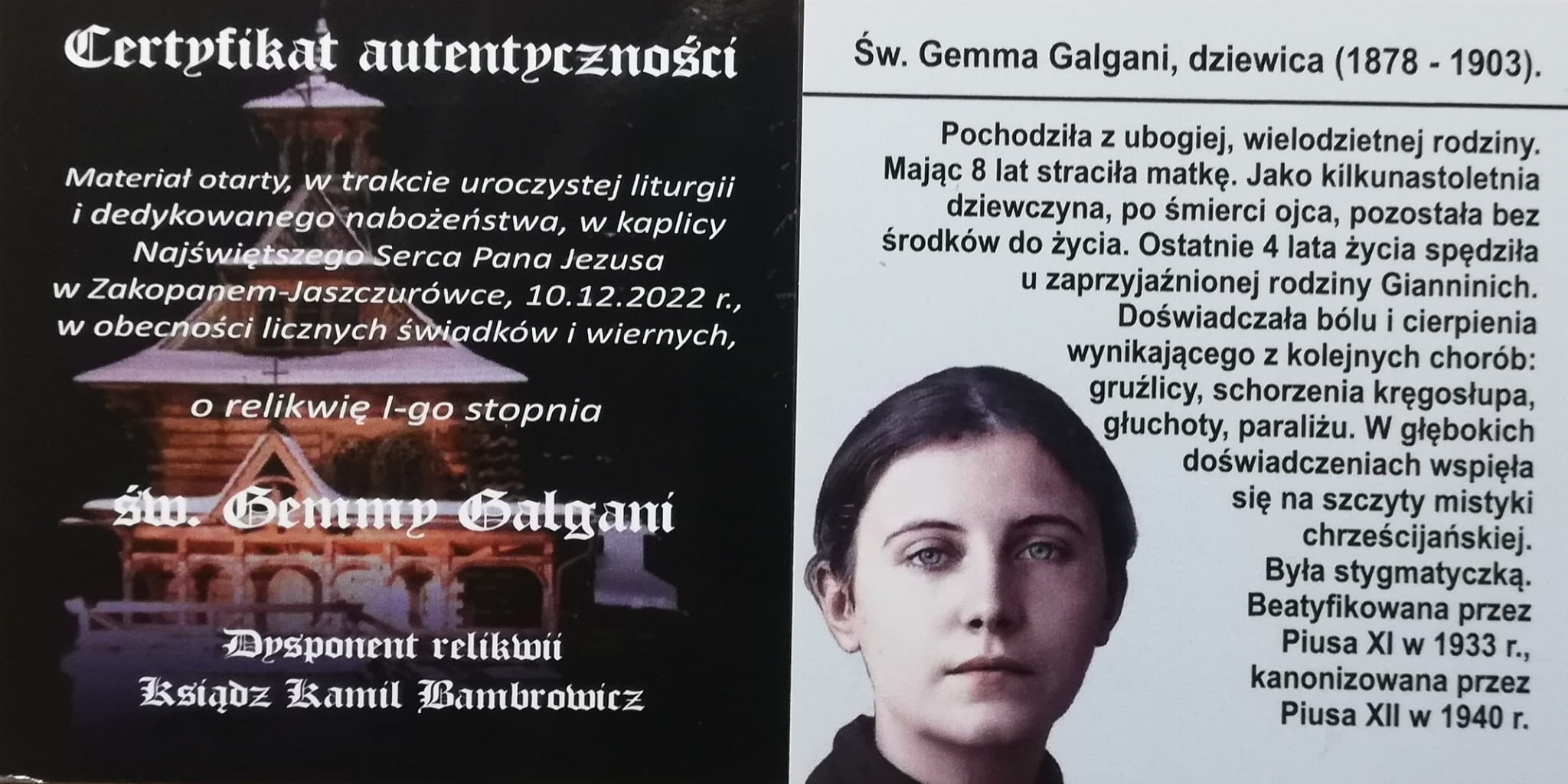 W metalowym łączniku różańca znajduje się kawałek materiału potartego o relikwię I stopnia Świętej Gemmy Galgani, pobłogosławionego i poświęconego podczas specjalnego nabożeństwa, w obecności wiernych i świadków, co zostało potwierdzone certyfikatem.