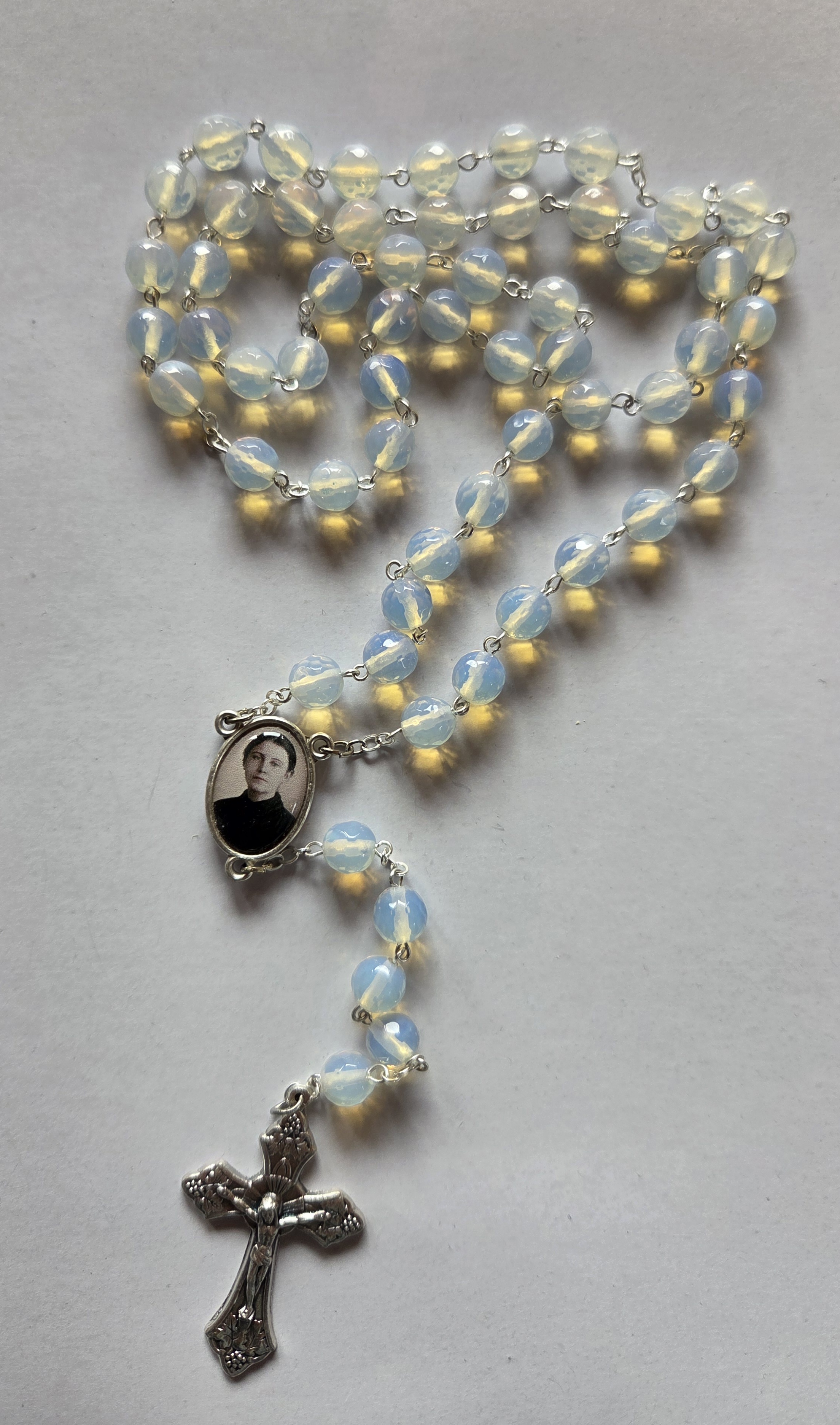 Piękny różaniec z relikwią św. Gemmy Galgani. Paciorki z kamieni półszlachetnych - opale.