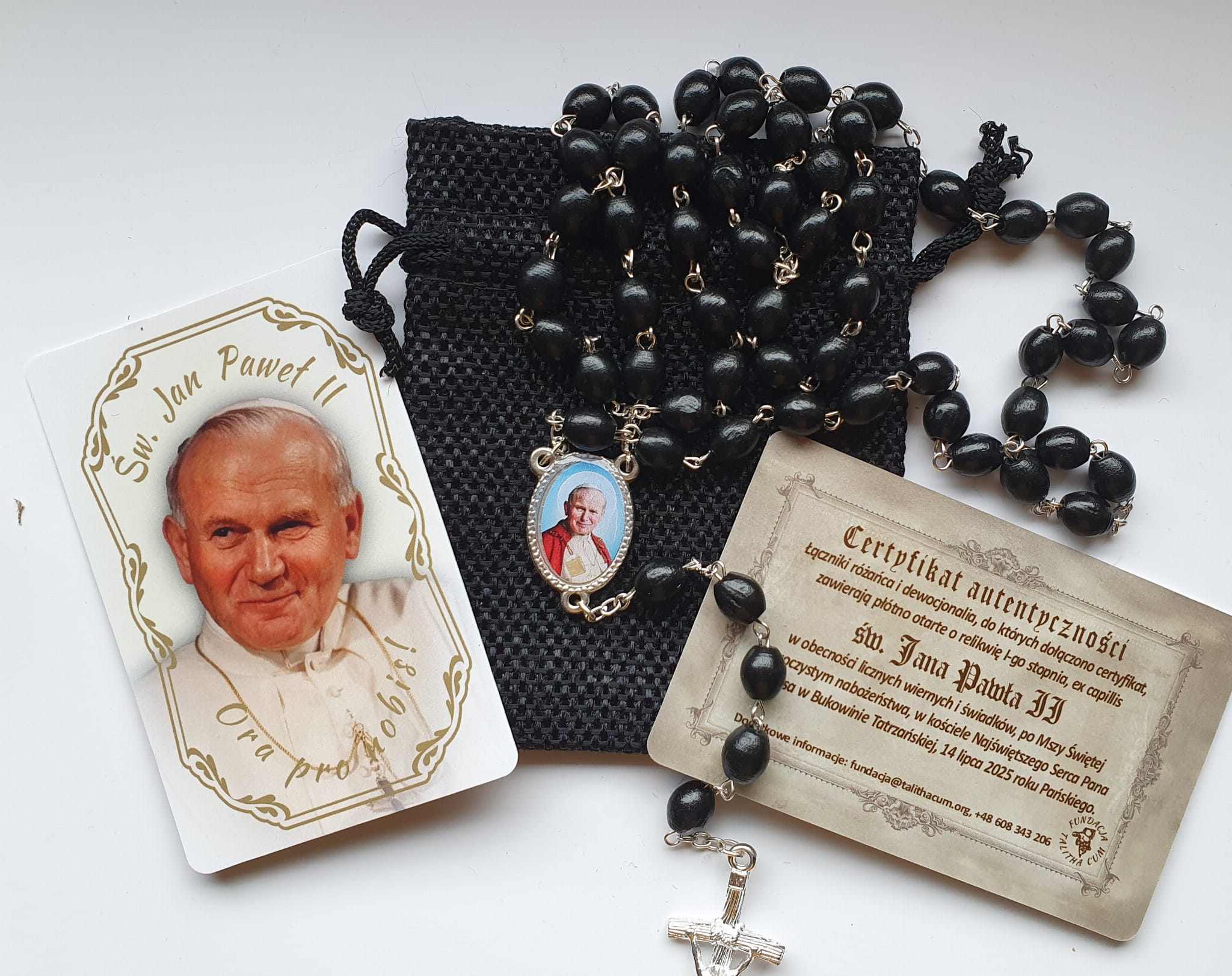 W metalowym łączniku różańca znajduje się kawałek materiału potartego o relikwię I świętego Jana Pawła II, pobłogosławiony i poświęcony podczas specjalnego nabożeństwa, w obecności wiernych i świadków, co zostało potwierdzone certyfikatem. Certyfikat autentyczności (oryginał) jest dostępny, na życzenie, w Fundacji TALITHA CUM (Tel. 608343206)