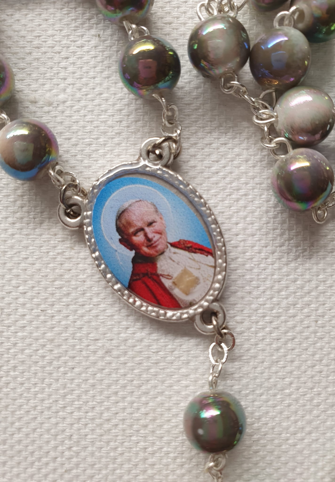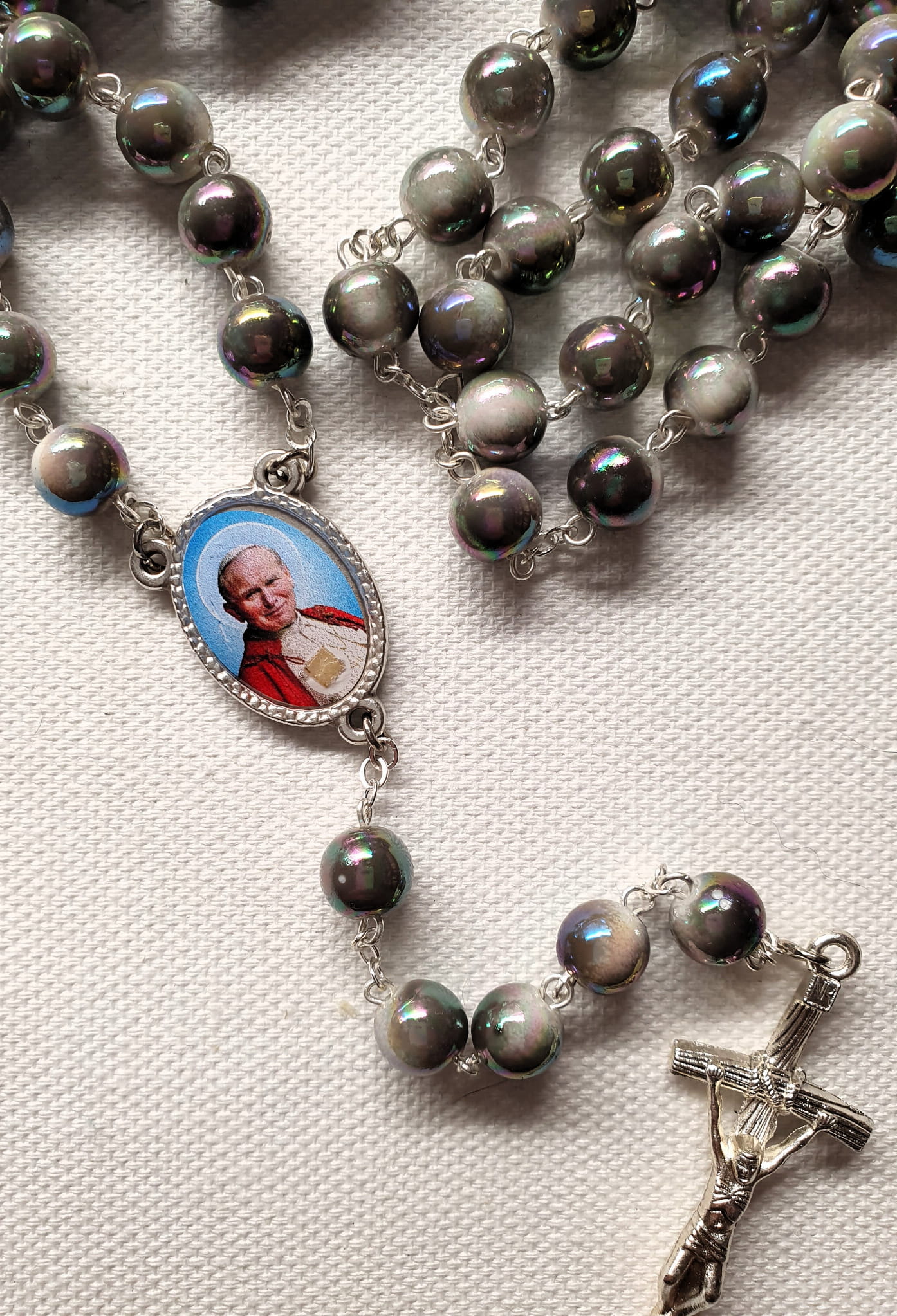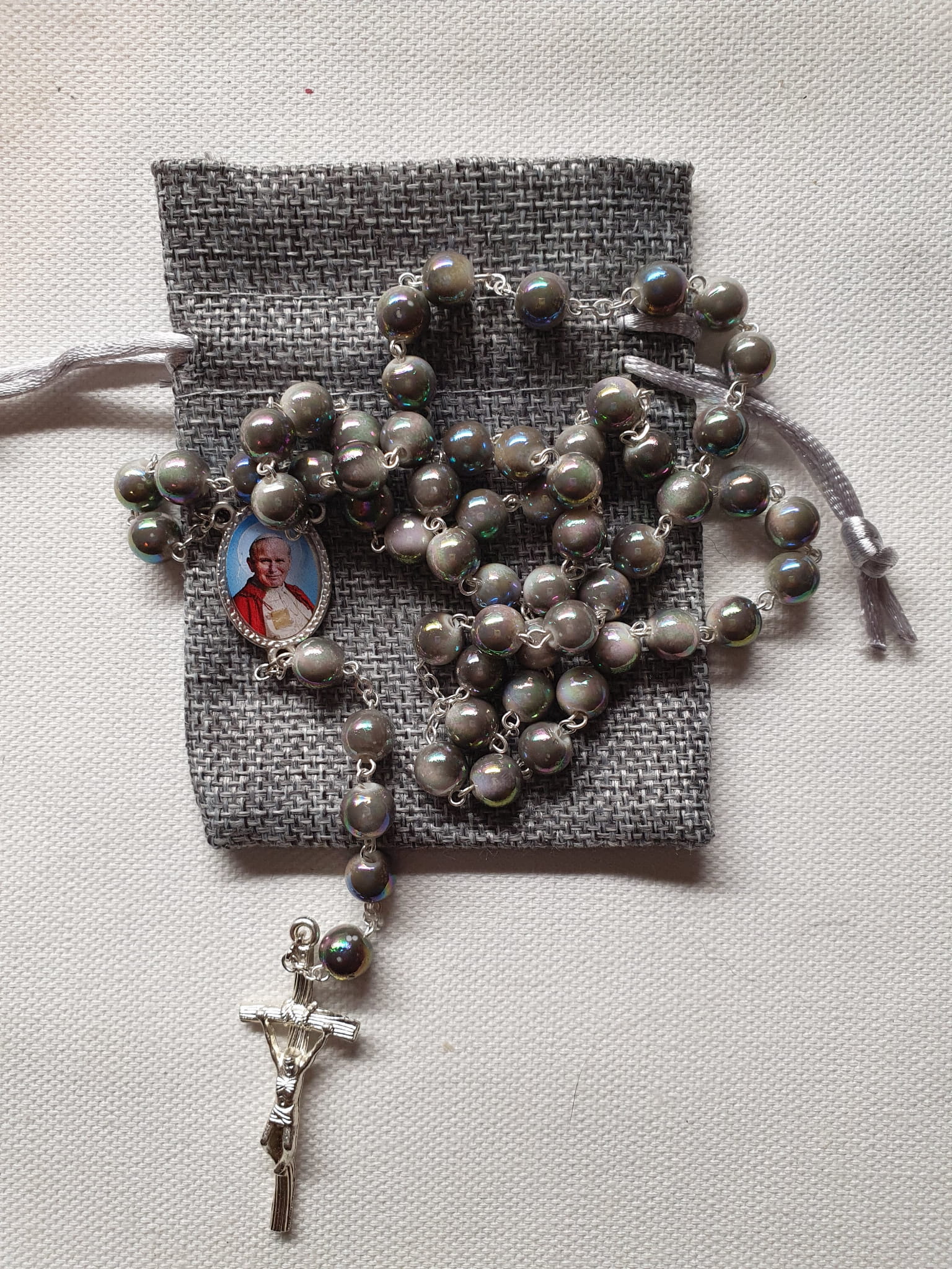 Różaniec z relikwią III stopnia św. Jana Pawła II. Śliczne paciorki szare z fioletowymi odcieniami. Średnica paciorków 0,8 cm.