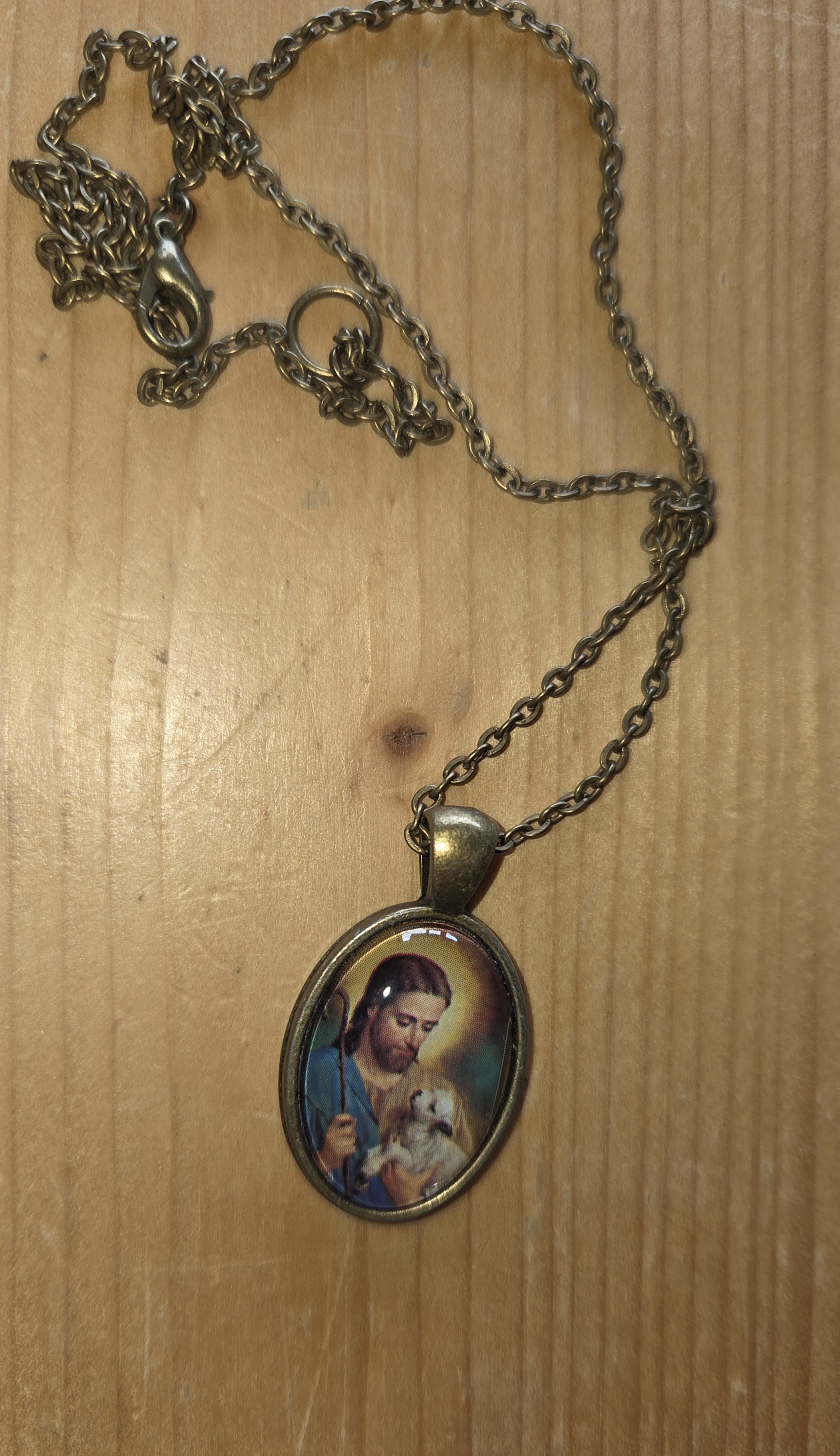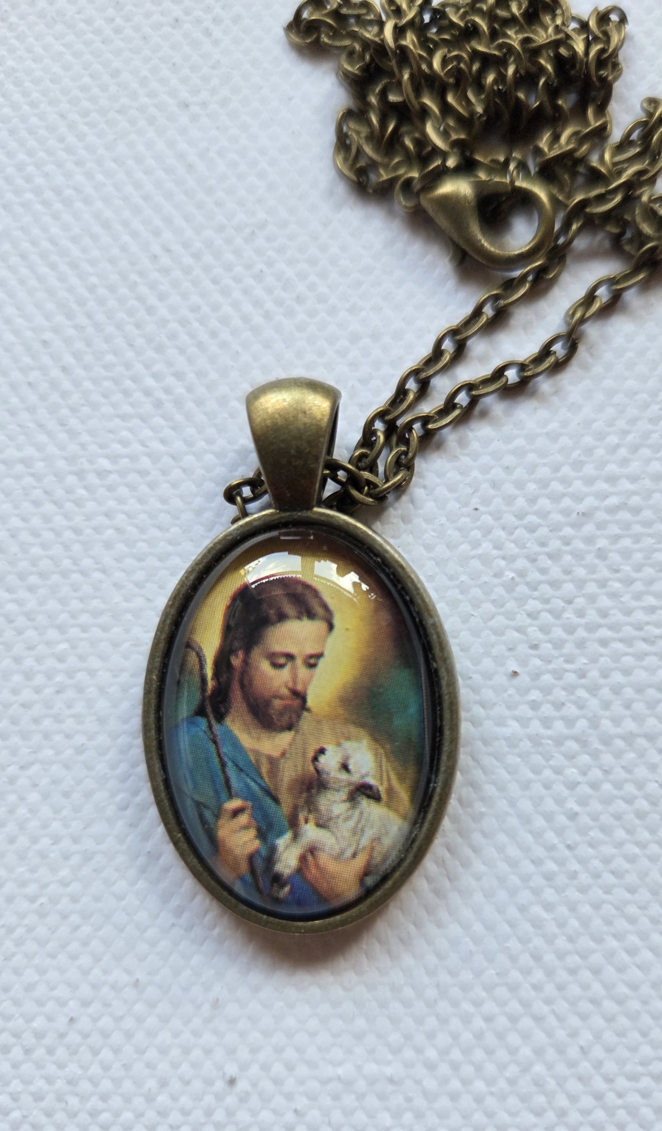 Medalion stylowy z kolorowym wizerunkiem PANA JEZUSA - DOBREGO PASTERZA, ręcznie wykonany. Szklane, wypukłe "oczko" owalne (wys: 3cm, szer.1,9cm), oprawione jest w metal w kolorze starego brązu. Łańcuszek 55 cm (z łańcuszkiem-"przedłużką") zapinany na karabińczyk. Zdjęcie nie oddaje urody medalionu, bo bardzo trudno jest sfotografować wypukłe szkło bez zbędnych refleksów świetlnych i odbić.