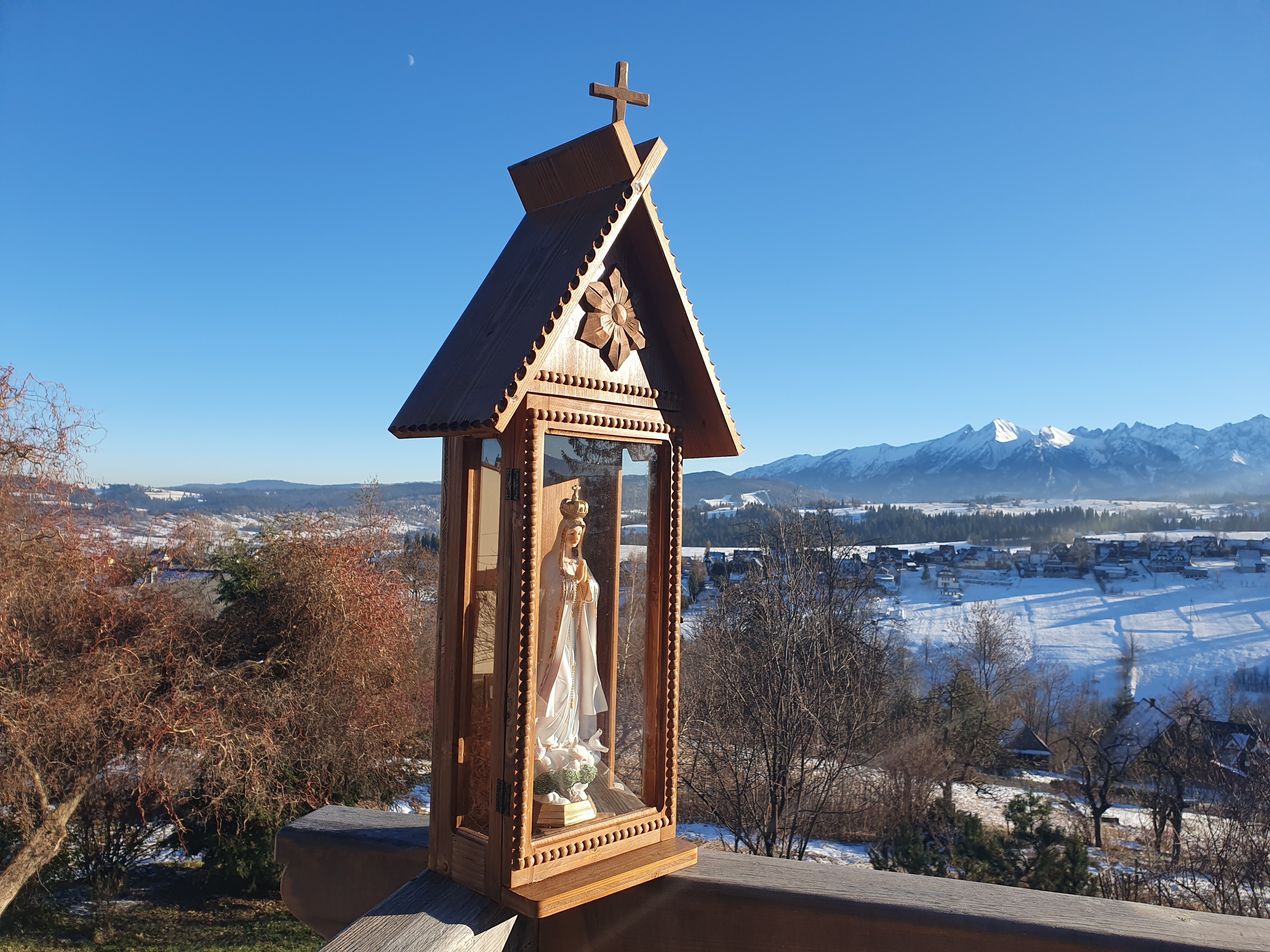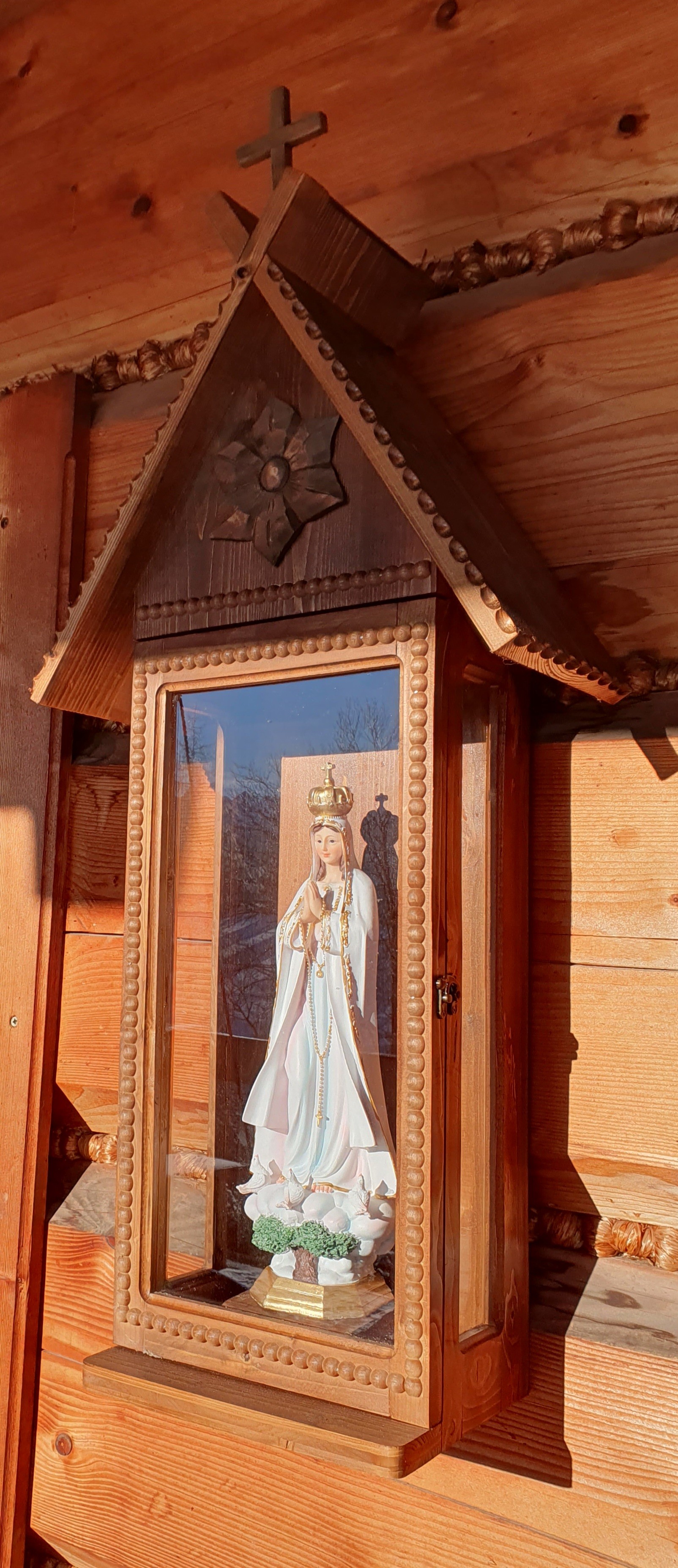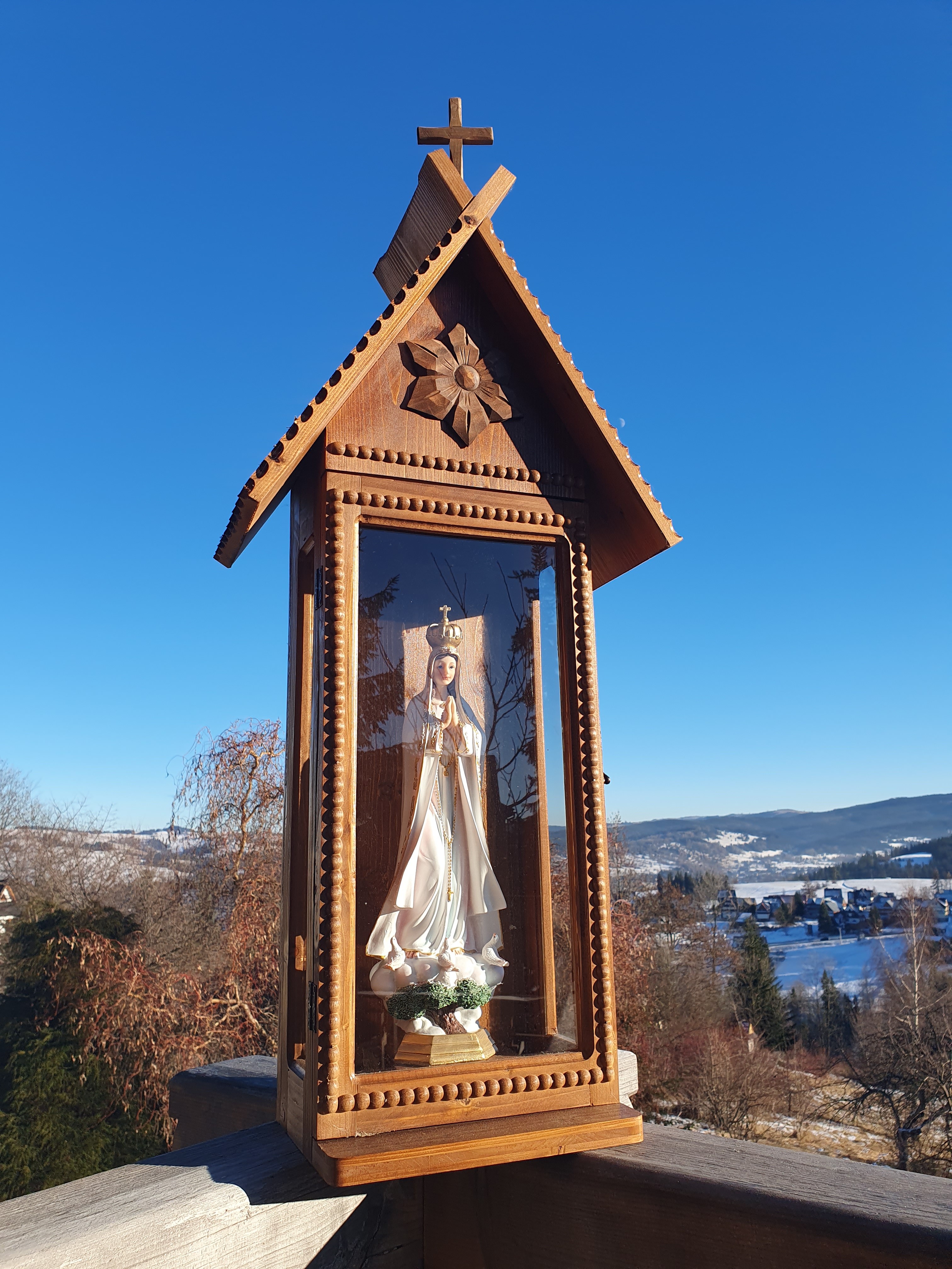 Drewno jest solidnie zaimpregnowane, więc kapliczka może być umieszczona na zewnątrz.