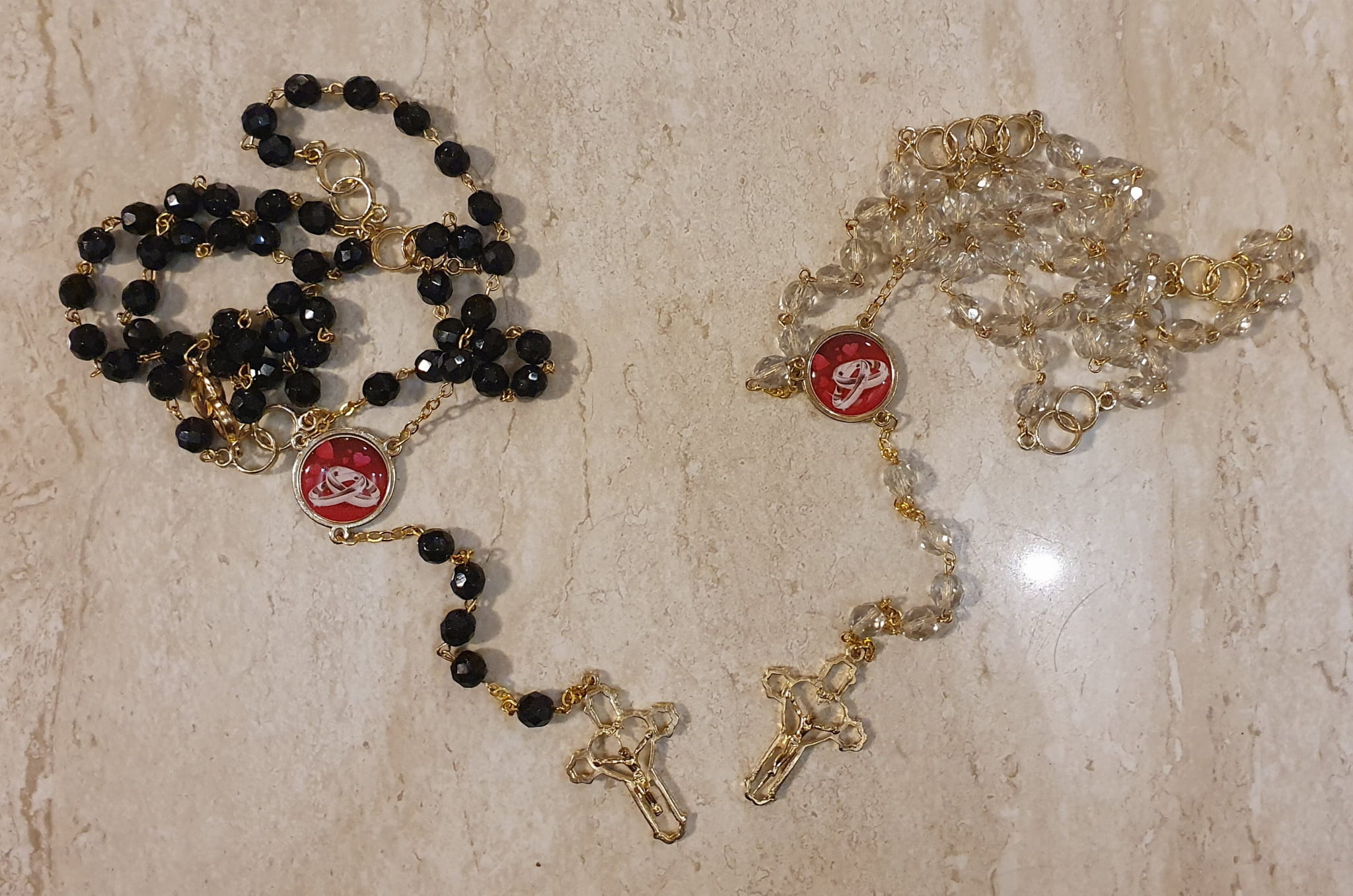 Różańce są dość duże (paciorki o średnicy 0,8 cm), na łańcuszkach złotego koloru, ze ślicznymi, oryginalnymi krzyżykami.