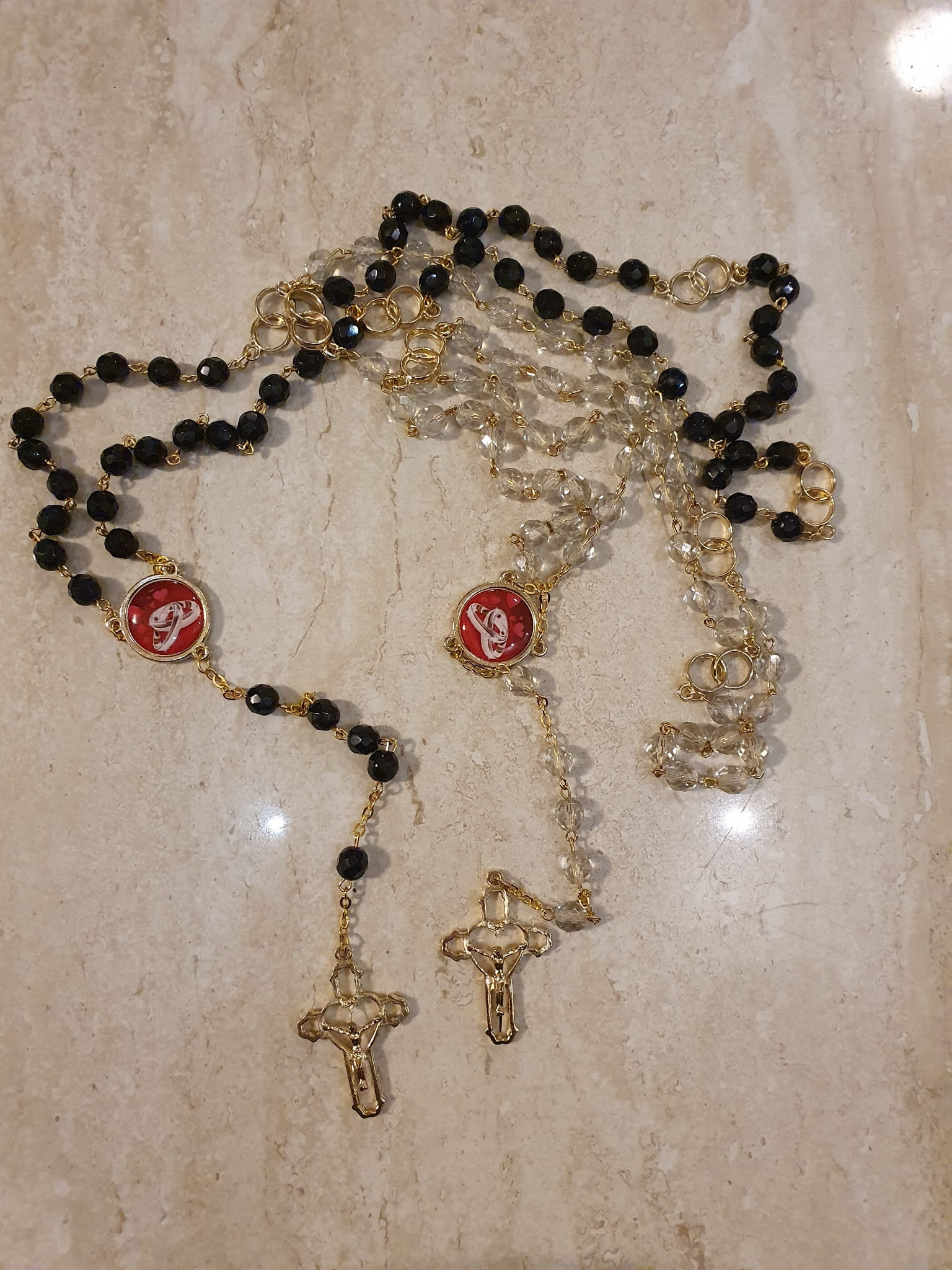 Komplet dwóch różańców w etui. Czarny i jasny-przezroczysty. Paciorki szklane, szlifowane "kryształki".