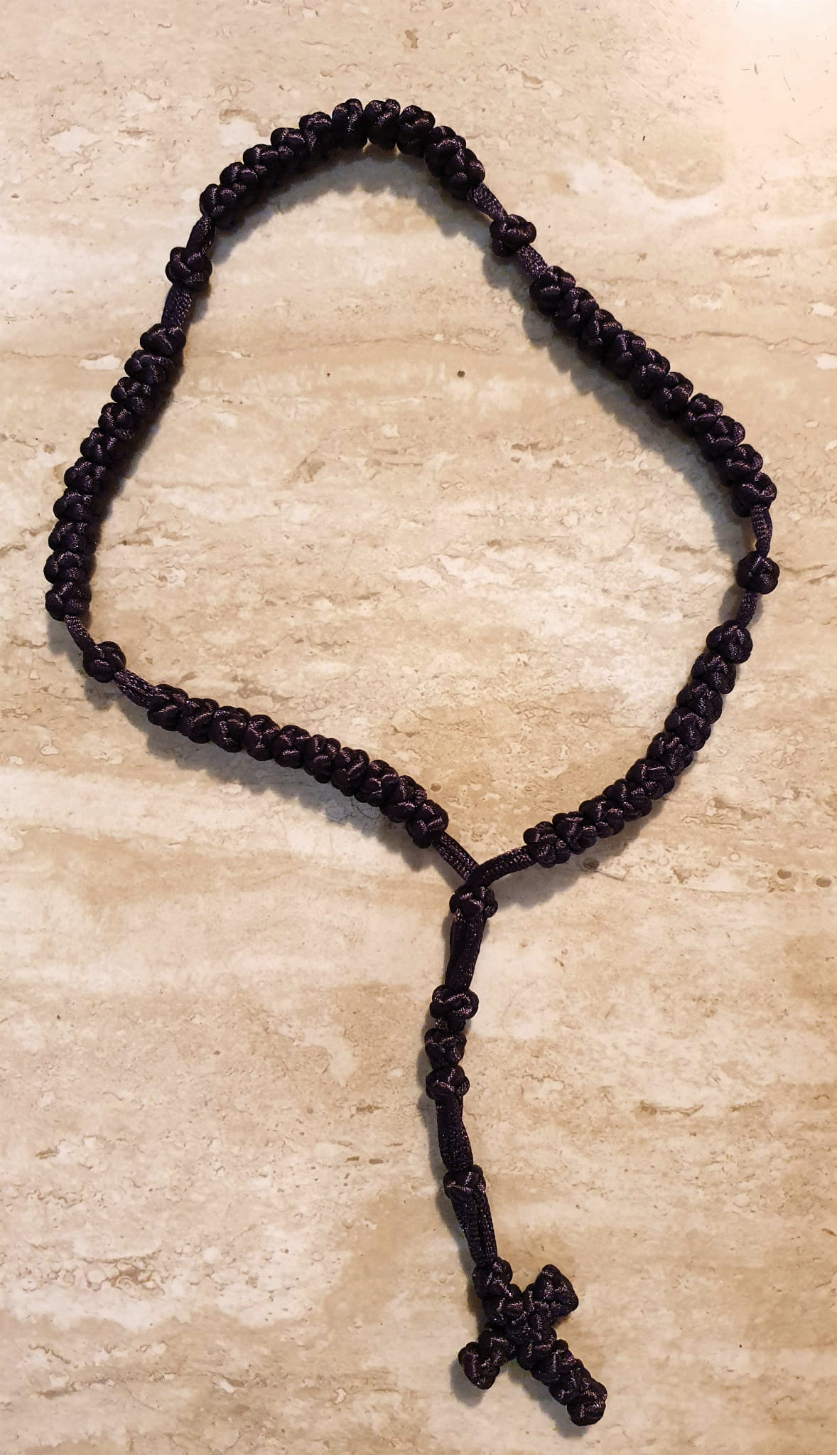 Różaniec ręcznie pleciony z satynowego sznurka. Kolor - bardzo ciemny, głęboki fiolet (śliwkowy).