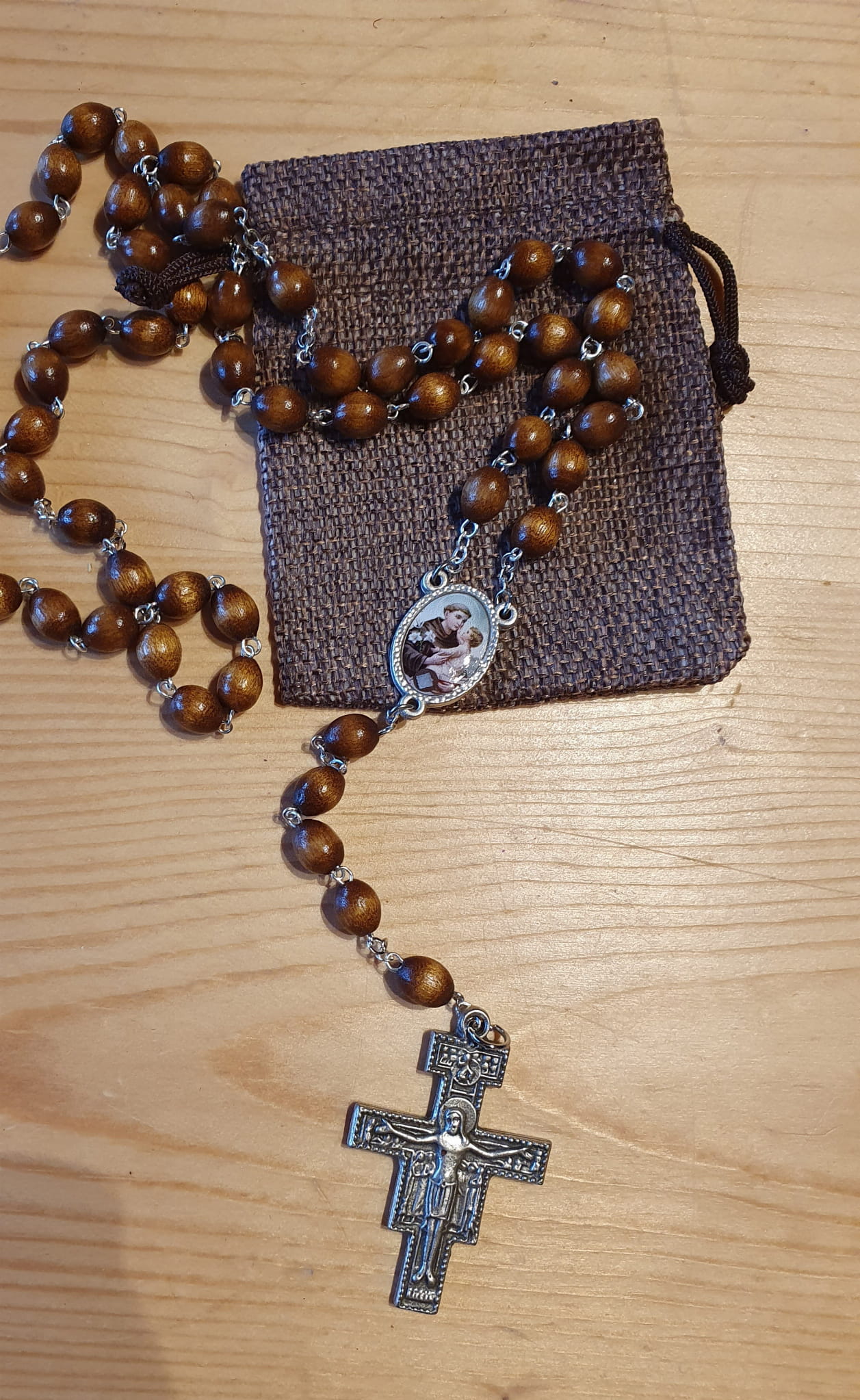 Różaniec z relikwią św. Antoniego. Kolor brązowy. Różaniec ma krzyżyk franciszkański z przepiękną modlitwą (wyraźną) na odwrocie: