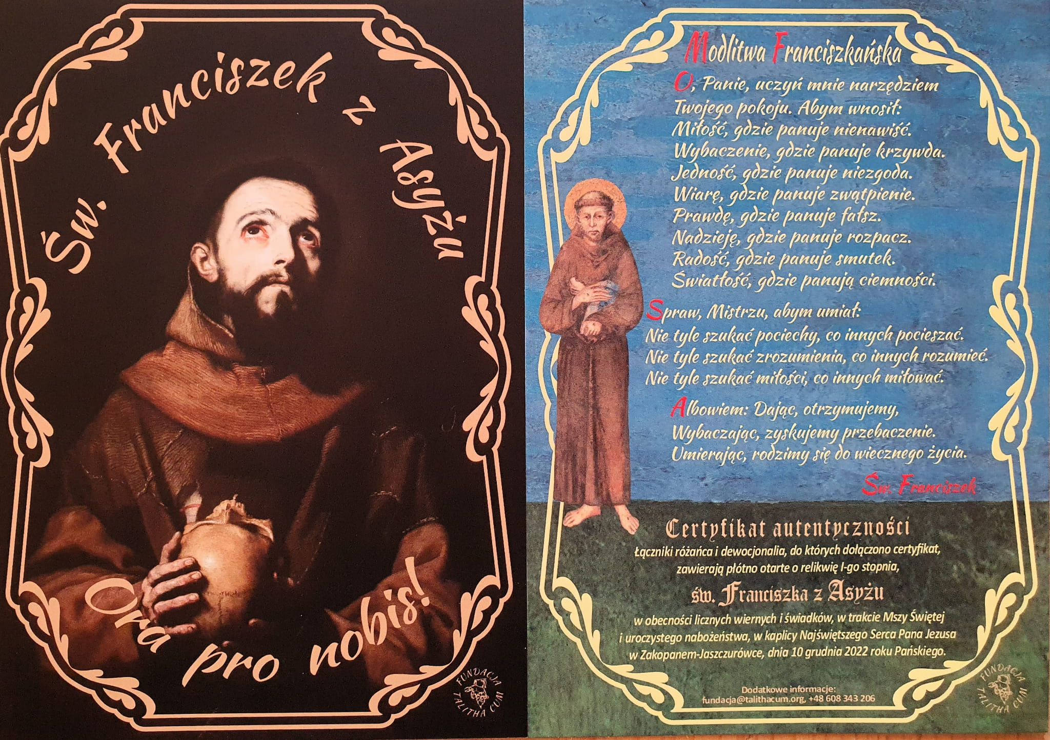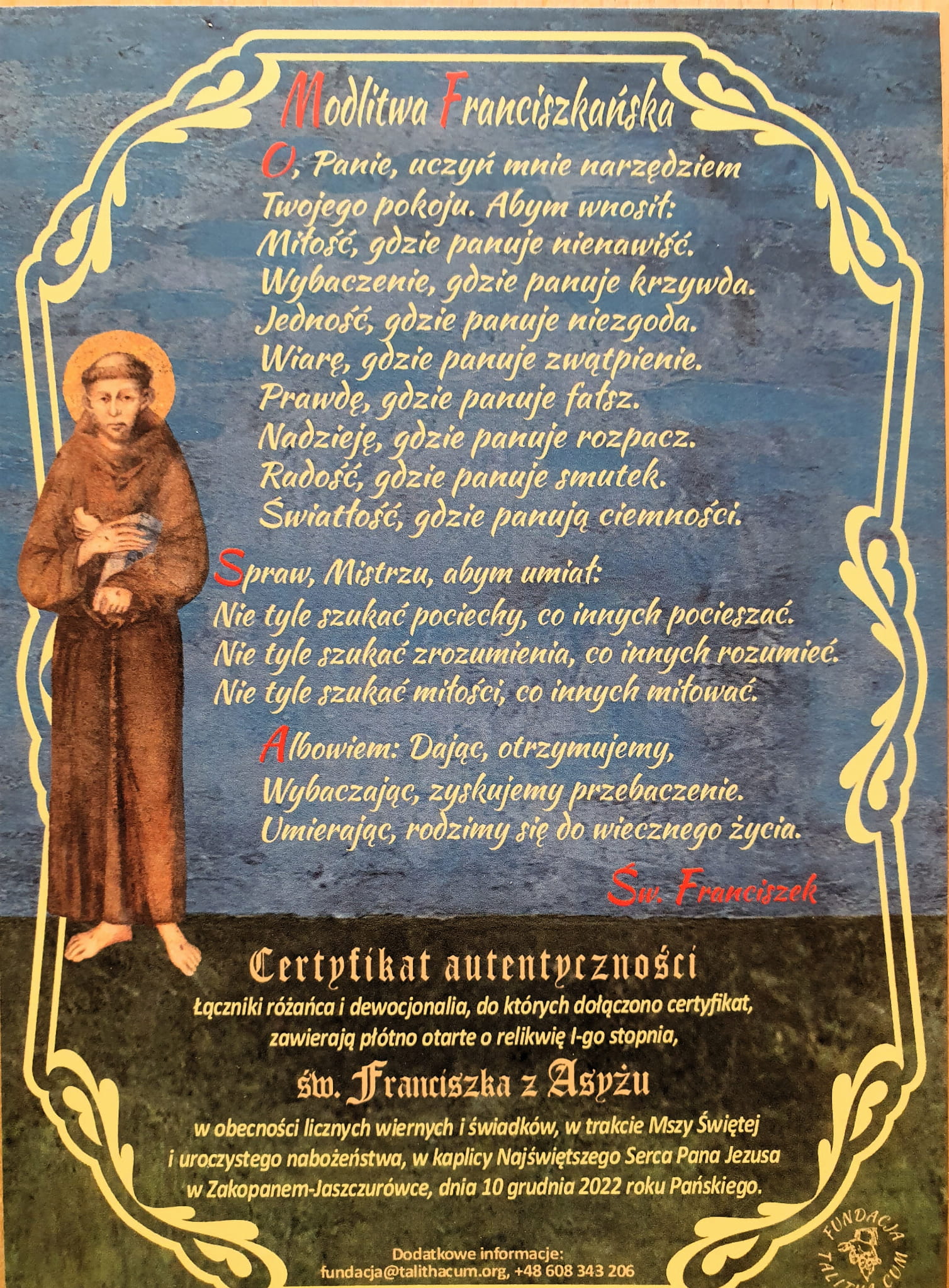 W metalowym łączniku różańca znajduje się kawałek materiału potartego o relikwię I stopnia Świętego Franciszka z Asyżu, pobłogosławionego i poświęconego podczas specjalnego nabożeństwa, w obecności wiernych i świadków, co zostało potwierdzone certyfikatem.