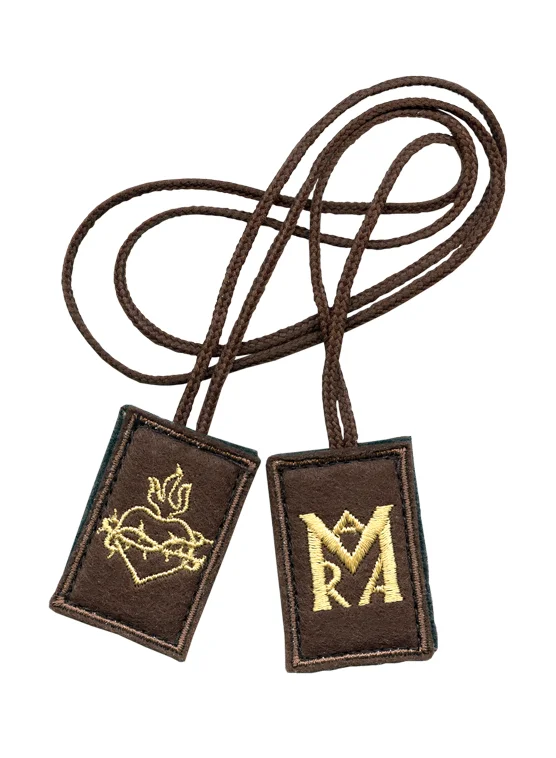Sukienny szkaplerz karmelitański haftowany z symbolami Matki Bożej i Najświętszego Serca Jezusa.