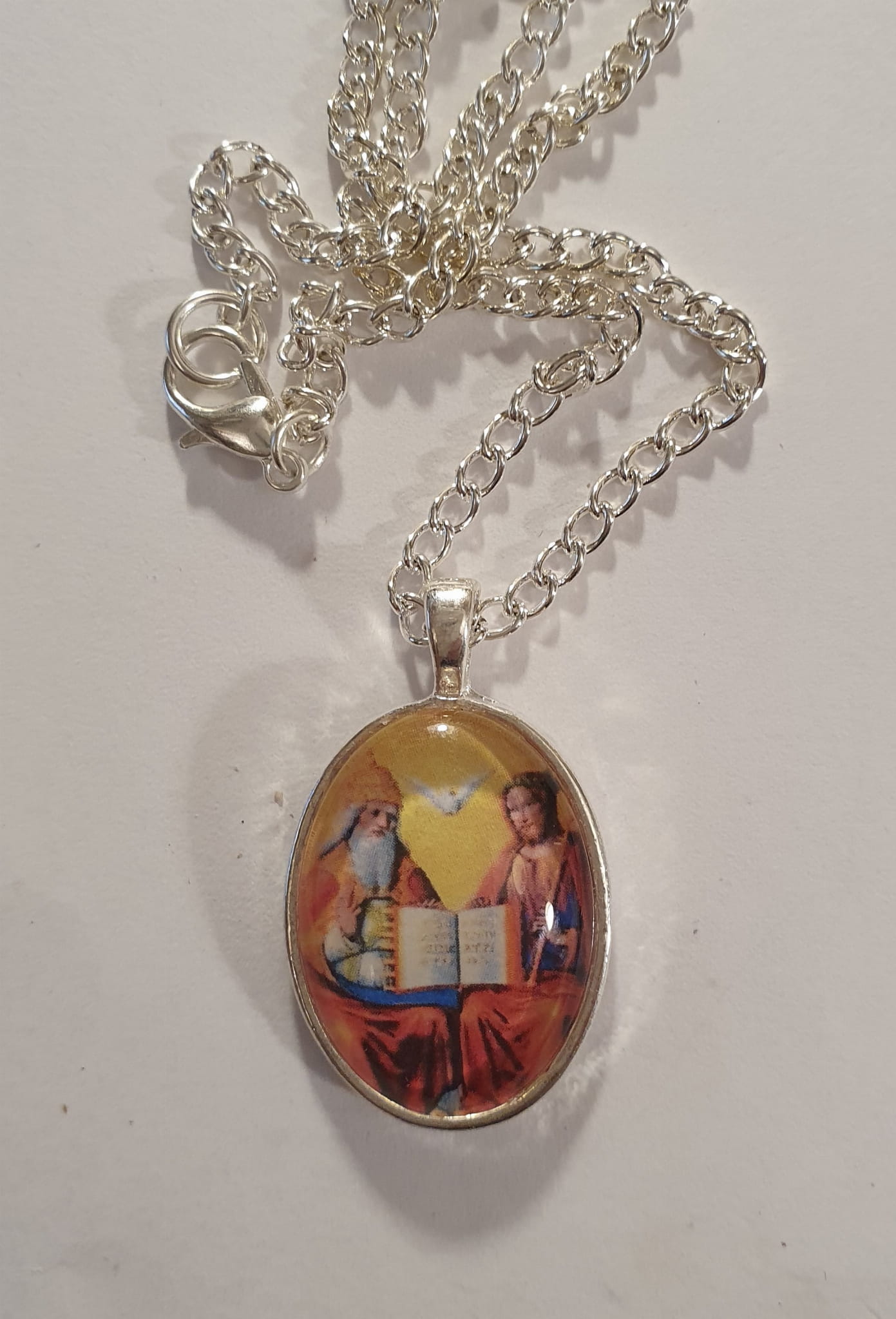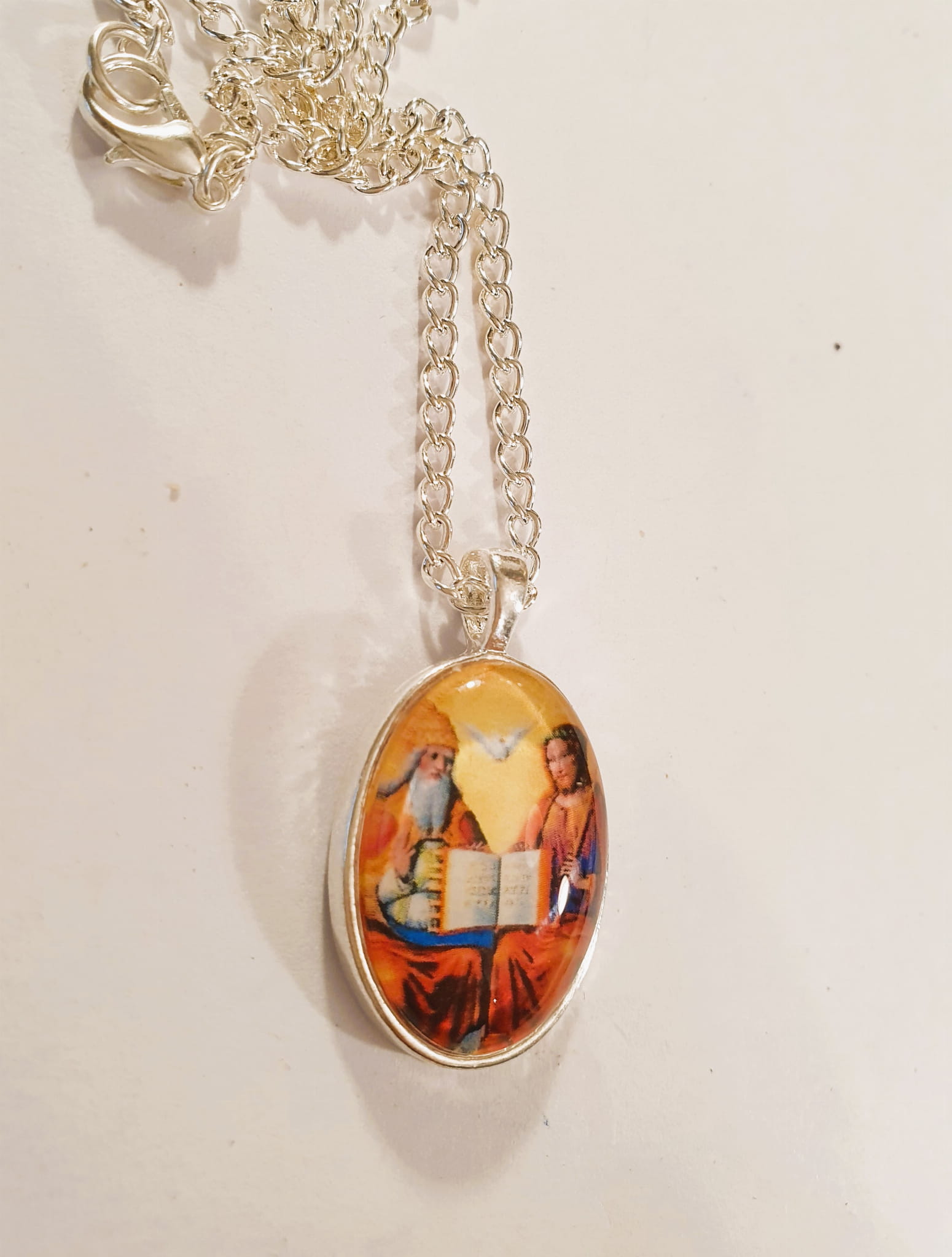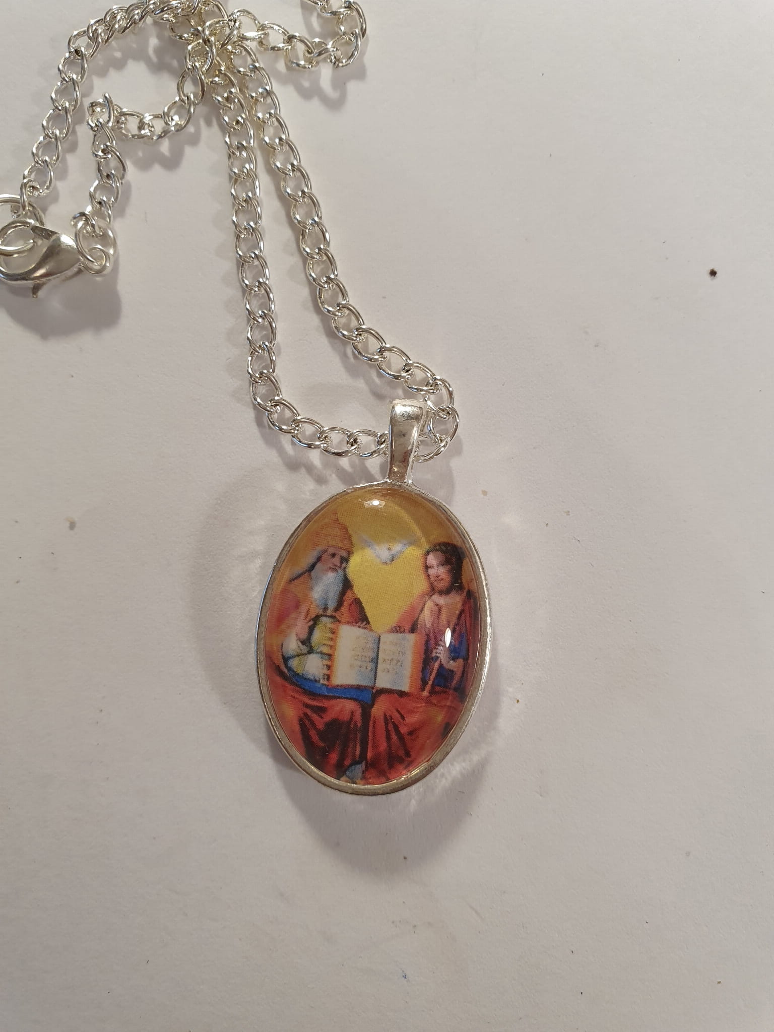 Ręcznie robiony, stylowy medalion na łańcuszku z kolorowym wizerunkiem Trójcy Świętej. Szklane oczko, wypukłe, w metalowej oprawie w kolorze oksydowanego srebra.